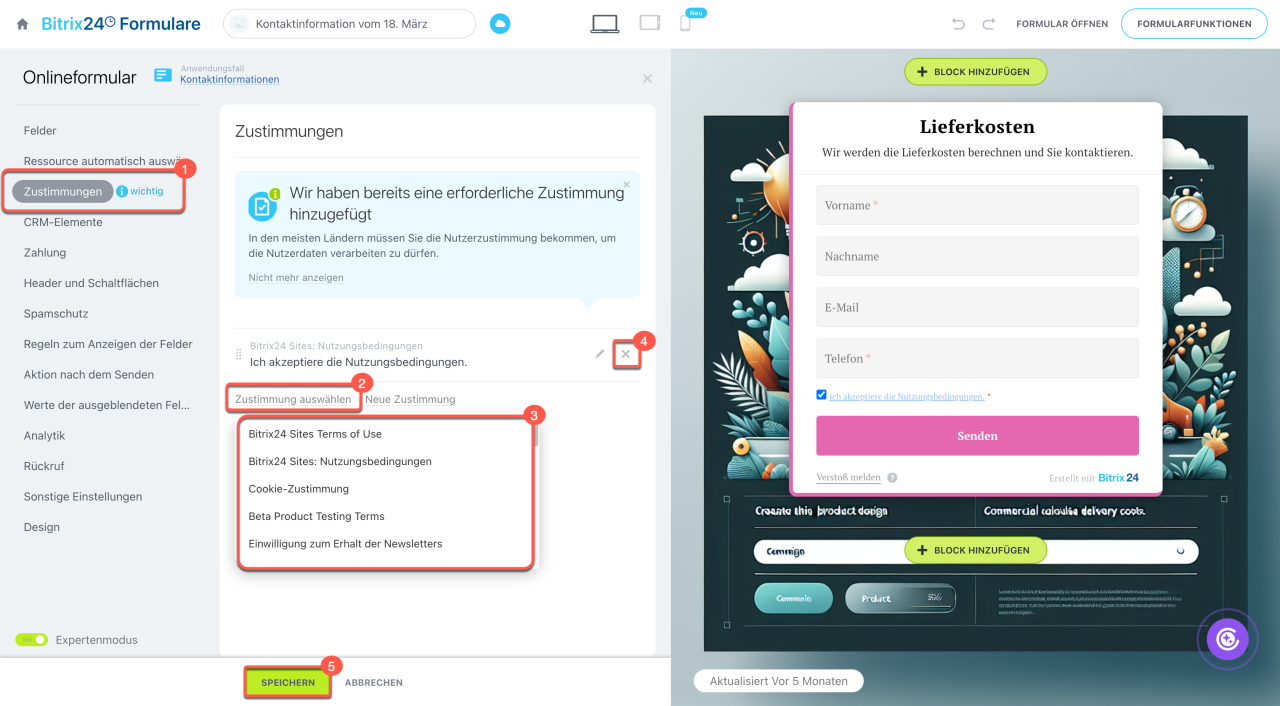 Mit Online-Formularen in Bitrix24 können Sie Zustimmungen von Nutzern einholen – etwa zur Verarbeitung personenbezogener Daten oder zum Erhalt von Marketing-Newslettern. Dies hilft Unternehmen, gesetzeskonform zu arbeiten, und schützt gleichzeitig die Interessen der Kunden. Ohne diese Zustimmungen dürfen Kontakte nicht im CRM gespeichert werden und keine Werbung versendet werden.