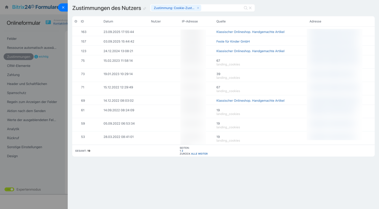- In der Liste der Zustimmungen werden das Datum, die IP-Adresse des Kunden, die Quelle und die Seite angezeigt, auf der der Kunde seine Zustimmung bestätigt hat. Informationen aus der Liste können nicht gelöscht werden.