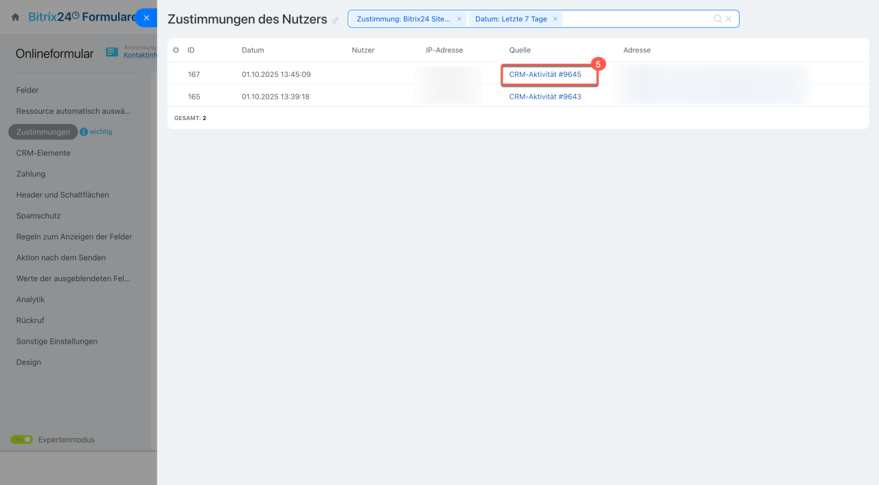 - Verwenden Sie den Filter, um Zustimmungen nach Parametern zu suchen. Um die Kundendaten einzusehen, klicken Sie in der Liste der Zustimmungen auf das CRM-Element im Feld Quelle.