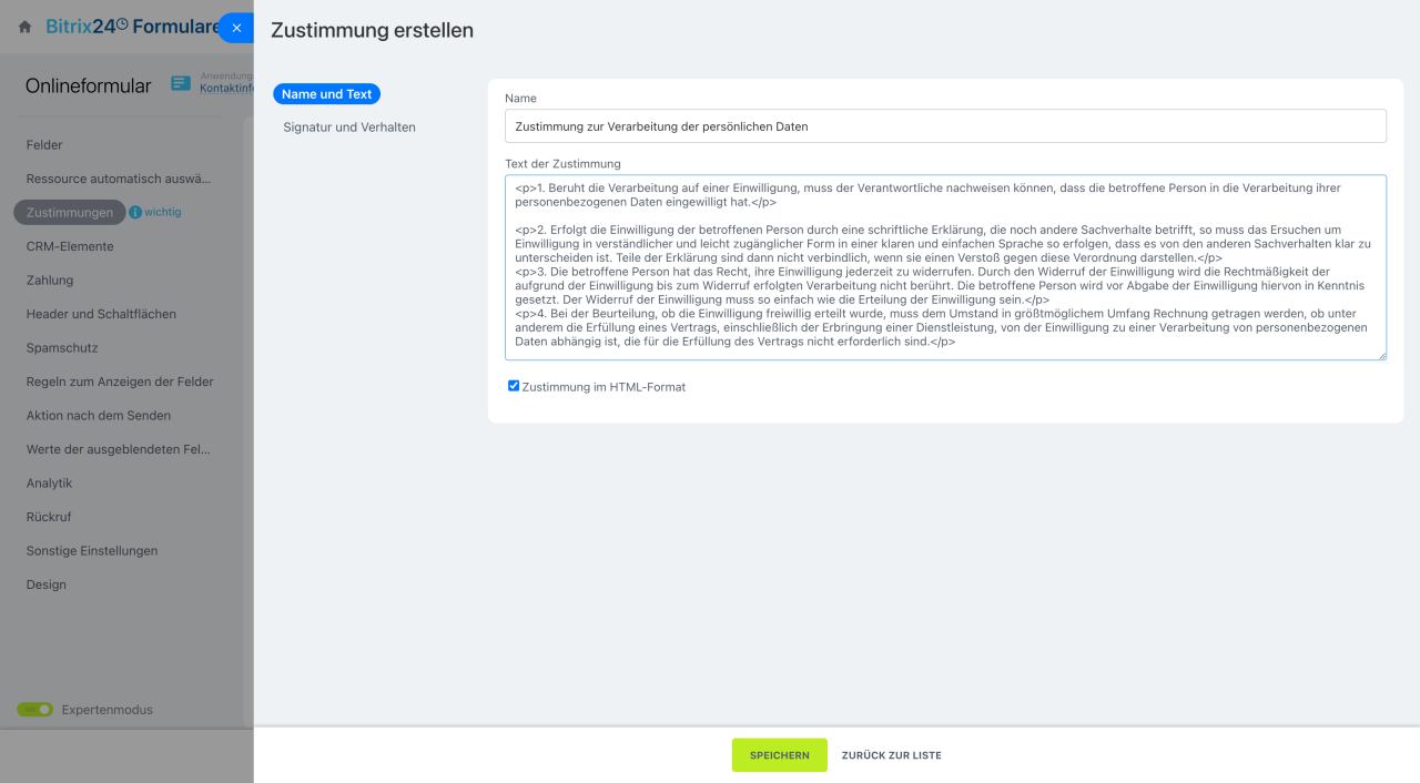 Text der Zustimmung — Der Text kann von Grund auf neu erstellt und mit HTML-Code formatiert werden: Überschriften hervorheben, Links hinzufügen usw. Damit der Text mit Tags korrekt angezeigt wird, aktivieren Sie die Option Zustimmung im HTML-Format.