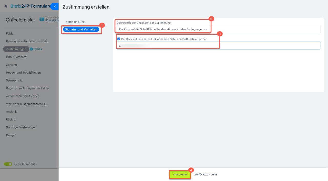 Klicken Sie auf Speichern — die Zustimmung wird dem Formular hinzugefügt.