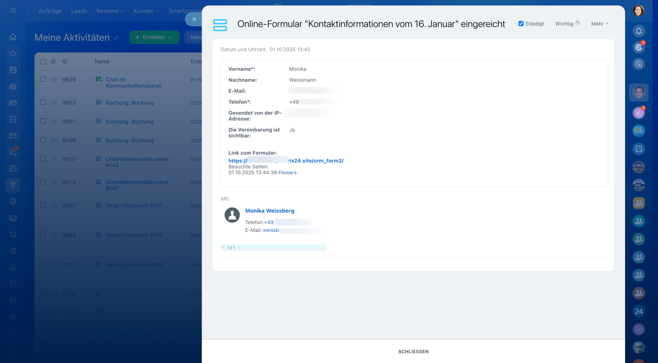 - Mit Online-Formularen in Bitrix24 können Sie Zustimmungen von Nutzern einholen – etwa zur Verarbeitung personenbezogener Daten oder zum Erhalt von Marketing-Newslettern. Dies hilft Unternehmen, gesetzeskonform zu arbeiten, und schützt gleichzeitig die Interessen der Kunden.
