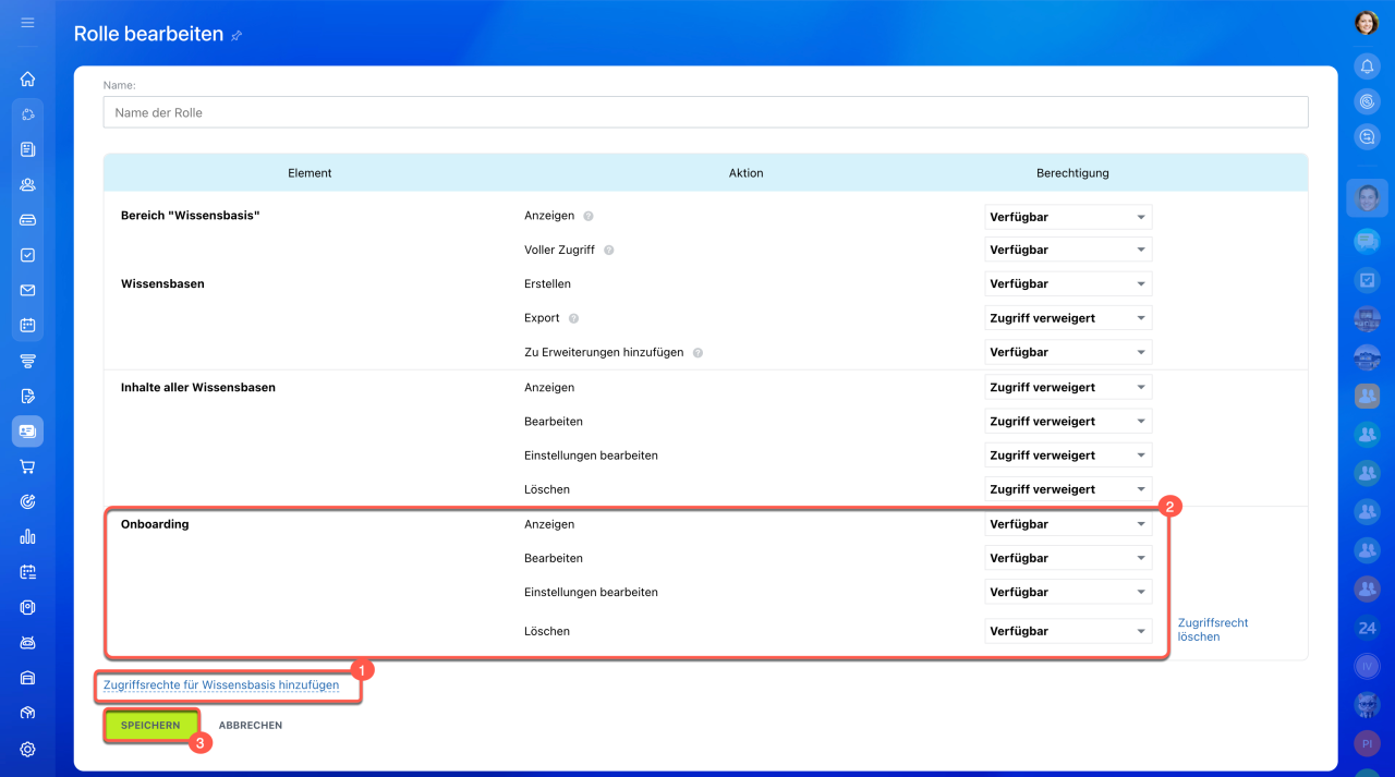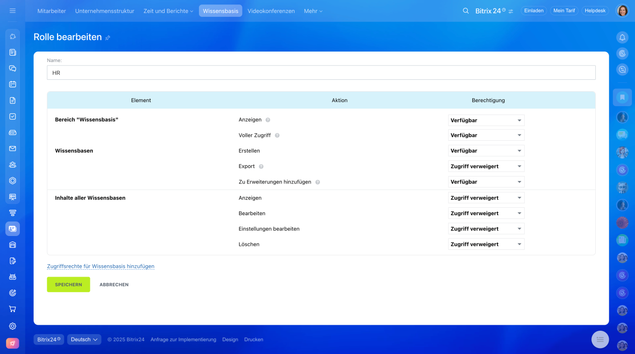 Standardmäßig haben alle Mitarbeiter vollständigen Zugriff auf die Wissensbasis des Unternehmens. Sie können die Zugriffsrechte für alle oder bestimmte Wissensbasen dieses Typs individuell anpassen. Diese Einstellungen sind nur für Administratoren verfügbar.