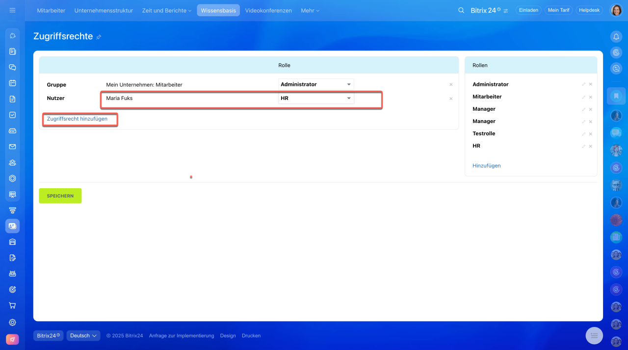 Die Zugriffsrechte im Block Wissensbasis haben Vorrang vor den Rechten einzelner Wissensbasen. Das bedeutet: Ein Mitarbeiter, der vollständigen Zugriff auf den gesamten Bereich hat, kann alle Wissensbasen einsehen – selbst wenn der Zugriff auf eine bestimmte Wissensbasis für ihn eingeschränkt ist.