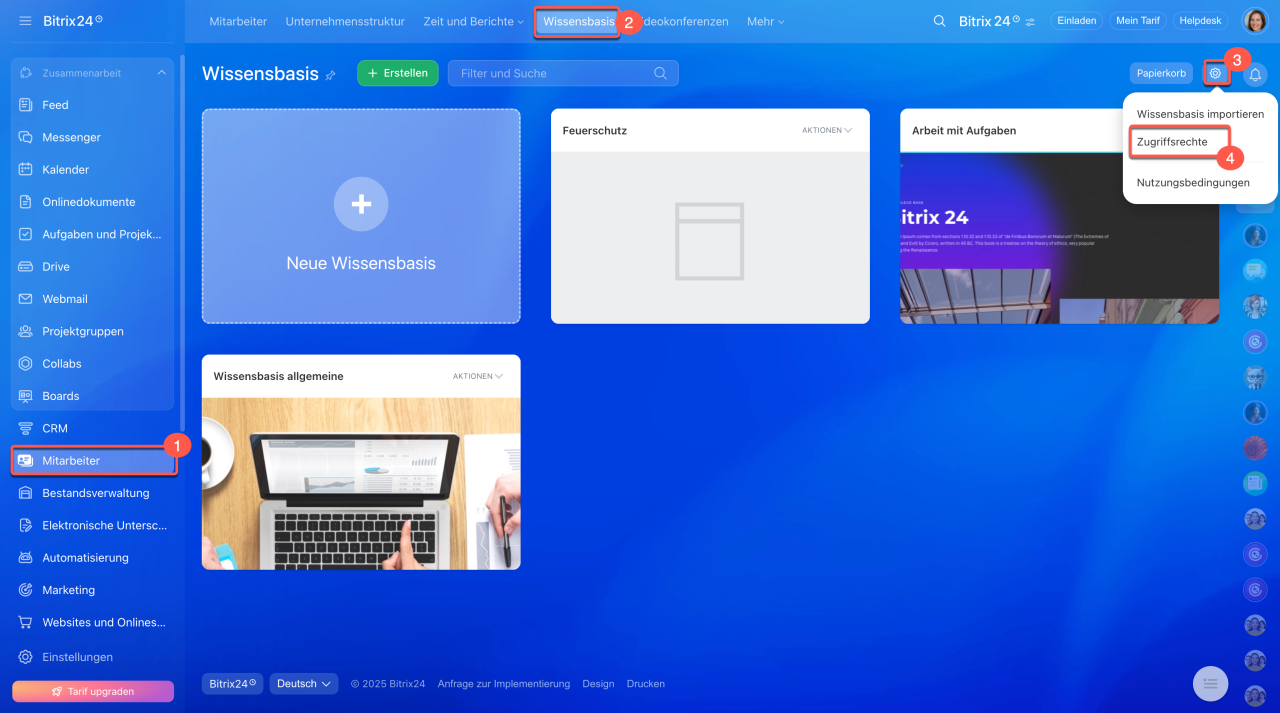 2. Konfigurieren Sie allgemeine Zugriffsrechte, z. B. ob die Wissensbasis in verschiedene Bitrix24-Tools und Bereiche hinzugefügt werden kann.
