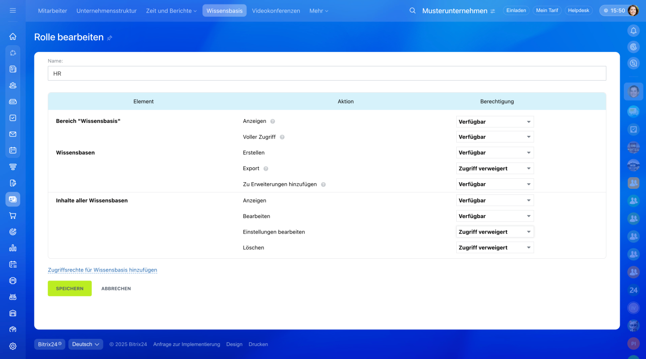 Die Zugriffsrechte im Block Wissensbasis haben Vorrang vor den Rechten einzelner Wissensbasen. Das bedeutet: Ein Mitarbeiter, der vollständigen Zugriff auf den gesamten Bereich hat, kann alle Wissensbasen einsehen – selbst wenn der Zugriff auf eine bestimmte Wissensbasis für ihn eingeschränkt ist.
