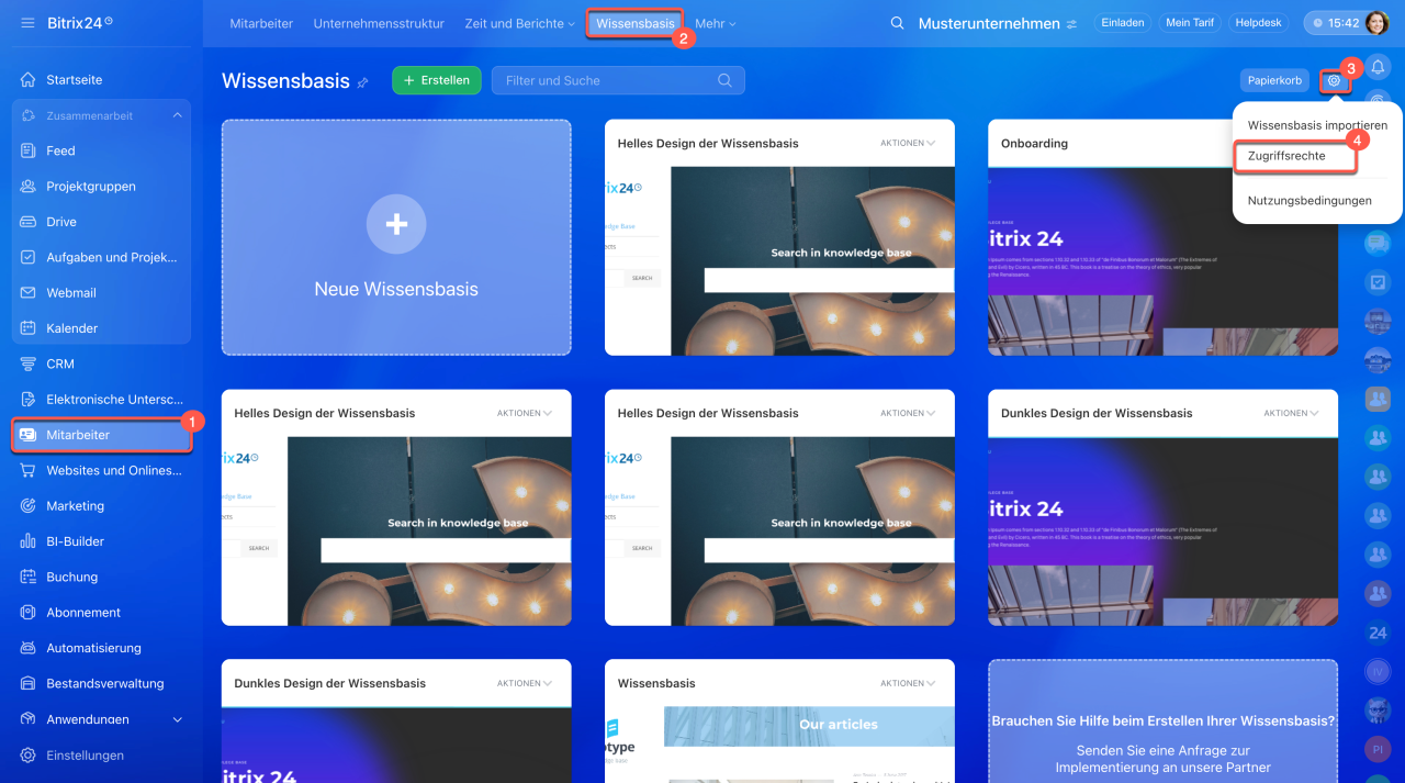 Standardmäßig haben alle Mitarbeiter vollständigen Zugriff auf die Wissensbasis des Unternehmens. Sie können die Zugriffsrechte für alle oder bestimmte Wissensbasen dieses Typs individuell anpassen. Diese Einstellungen sind nur für Administratoren verfügbar.