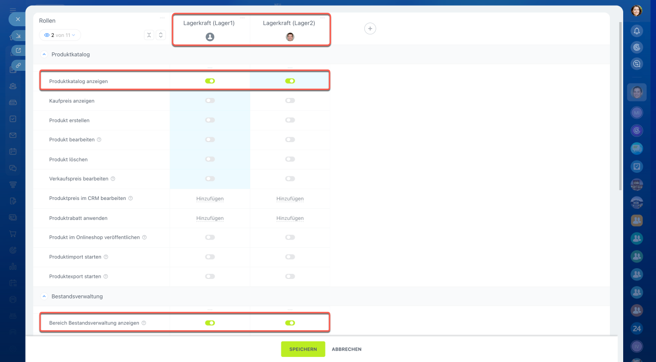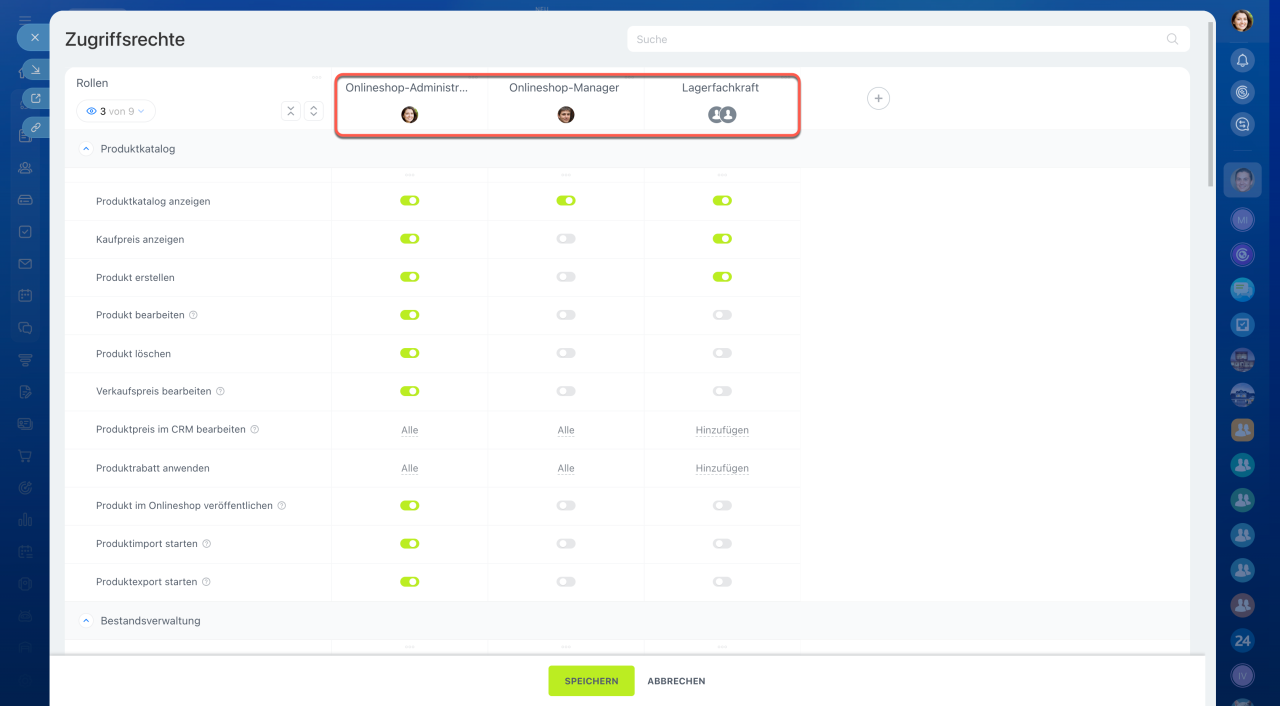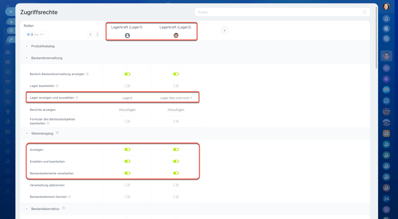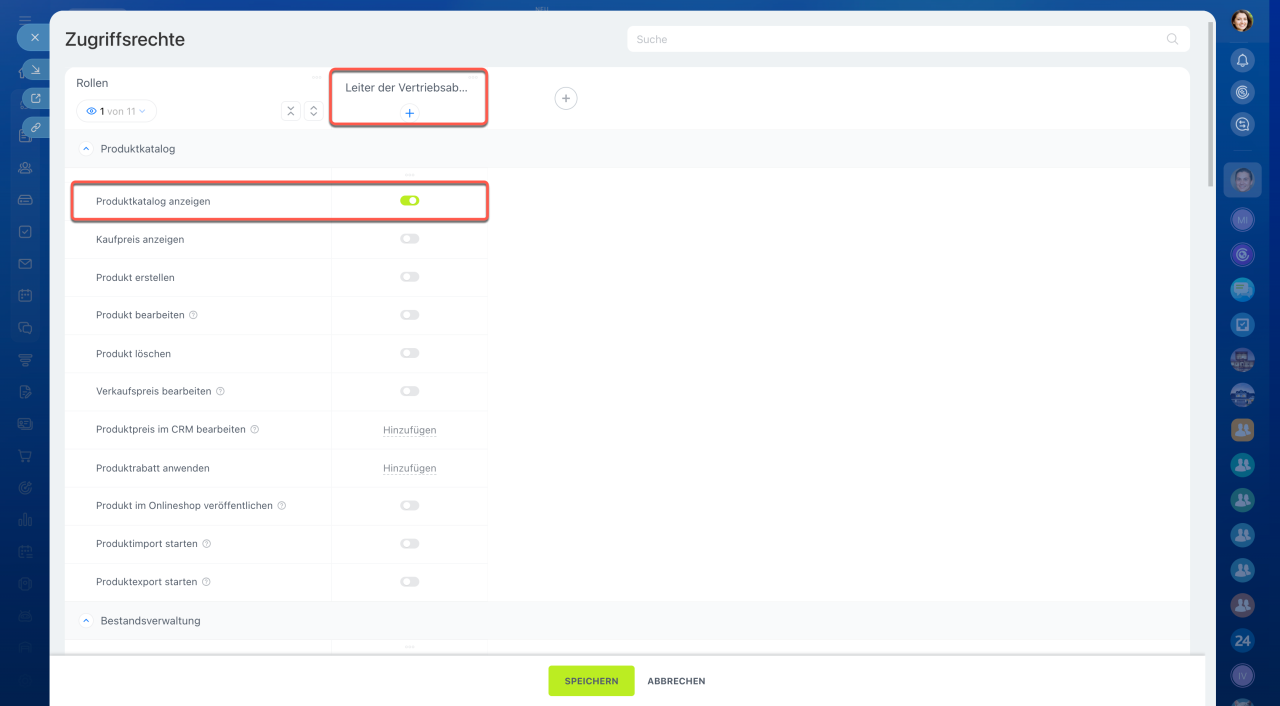 Öffnen Sie den Bereich CRM > Einstellungen > Zugriffsrechte für Bestandsverwaltung. Die Bestandsverwaltung ist mit dem Katalog verbunden – stellen Sie sicher, dass die Mitarbeiter Zugriff auf den Produktkatalog und CRM haben.