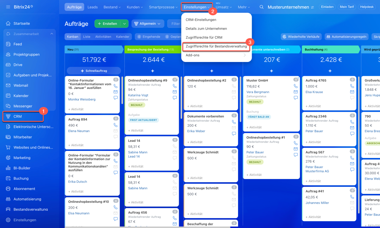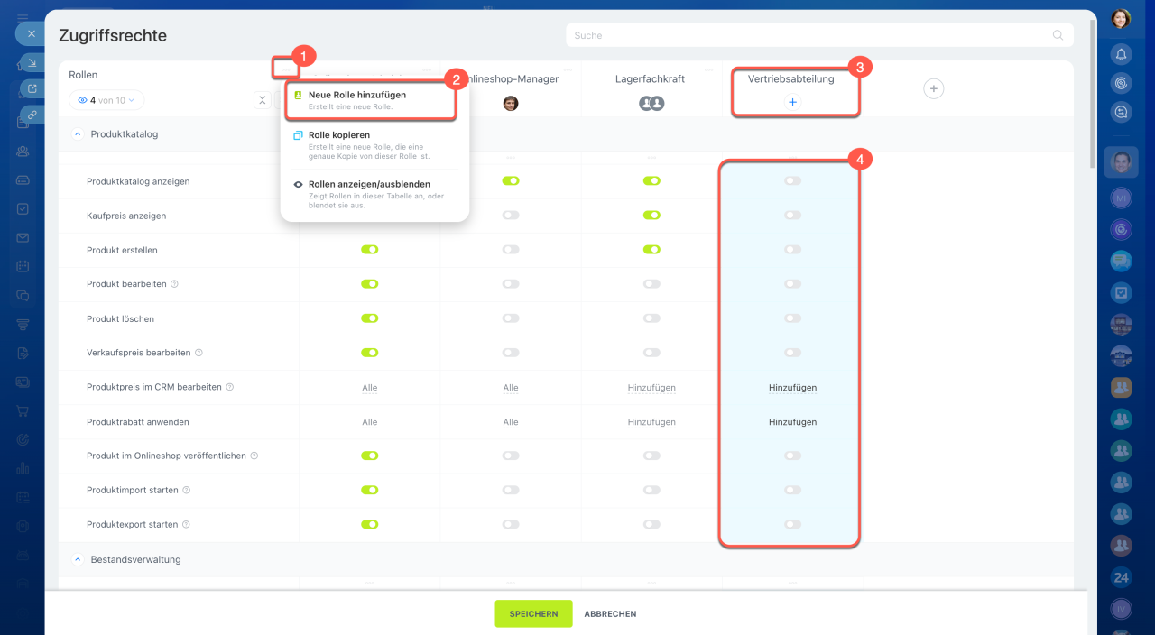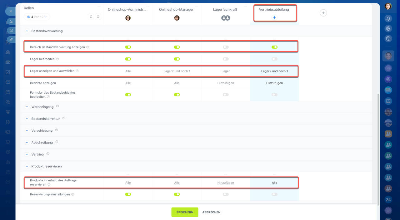 Öffnen Sie den Bereich CRM > Einstellungen > Zugriffsrechte für Bestandsverwaltung. Die Bestandsverwaltung ist mit dem Katalog verbunden – stellen Sie sicher, dass die Mitarbeiter Zugriff auf den Produktkatalog und CRM haben.