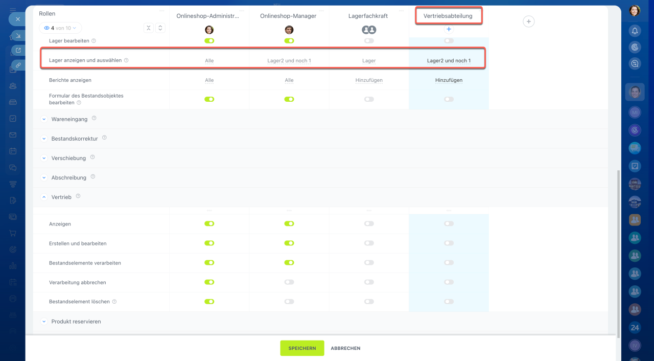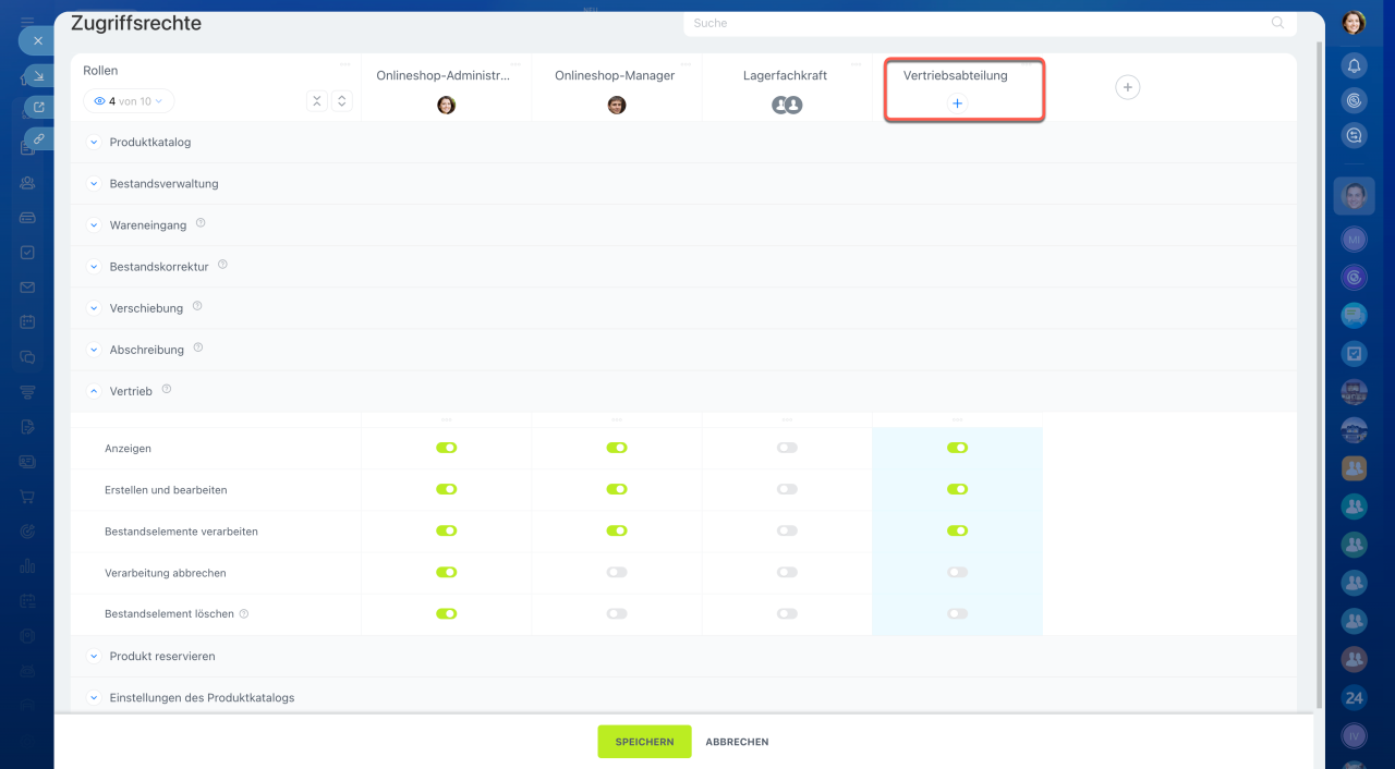 1. Erstellen Sie die Rolle „Vertrieb“ und aktivieren Sie folgende Rechte: Produktkatalog anzeigen, Bereich Bestandsverwaltung anzeigen, Lager anzeigen und auswählen sowie Produkte in Aufträgen reservieren. Für das Dokument „Vertrieb“ aktivieren Sie zudem: Anzeigen, Erstellen und bearbeiten, Bestandselemente verarbeiten. Dadurch können Vertriebsmitarbeiter Lager in Aufträgen auswählen, Produkte reservieren und Lieferungen erstellen.