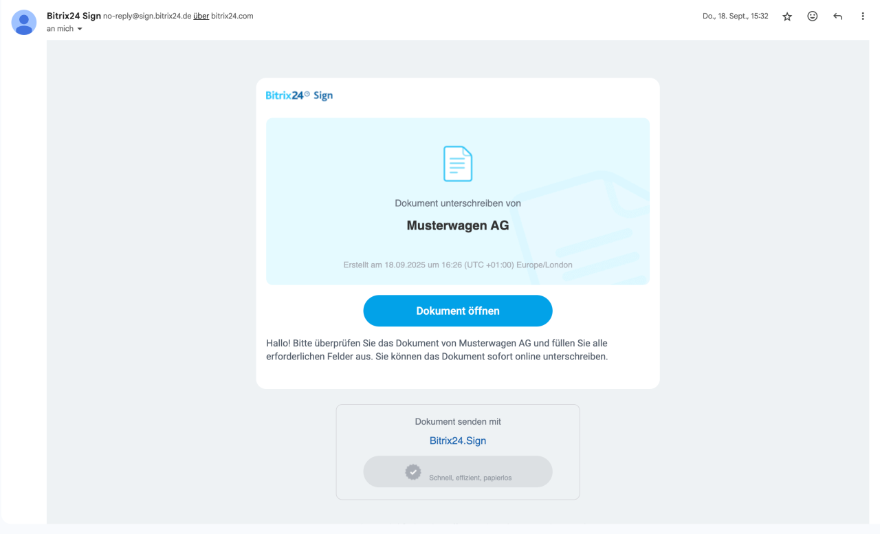 • Der Unterzeichnungsprozess ist für beide Parteien identisch – der Geschäftsführer oder ein anderer Mitarbeiter mit Unterzeichnungsrecht erhält einen Link zum Dokument per E-Mail oder SMS und unterzeichnet es.
