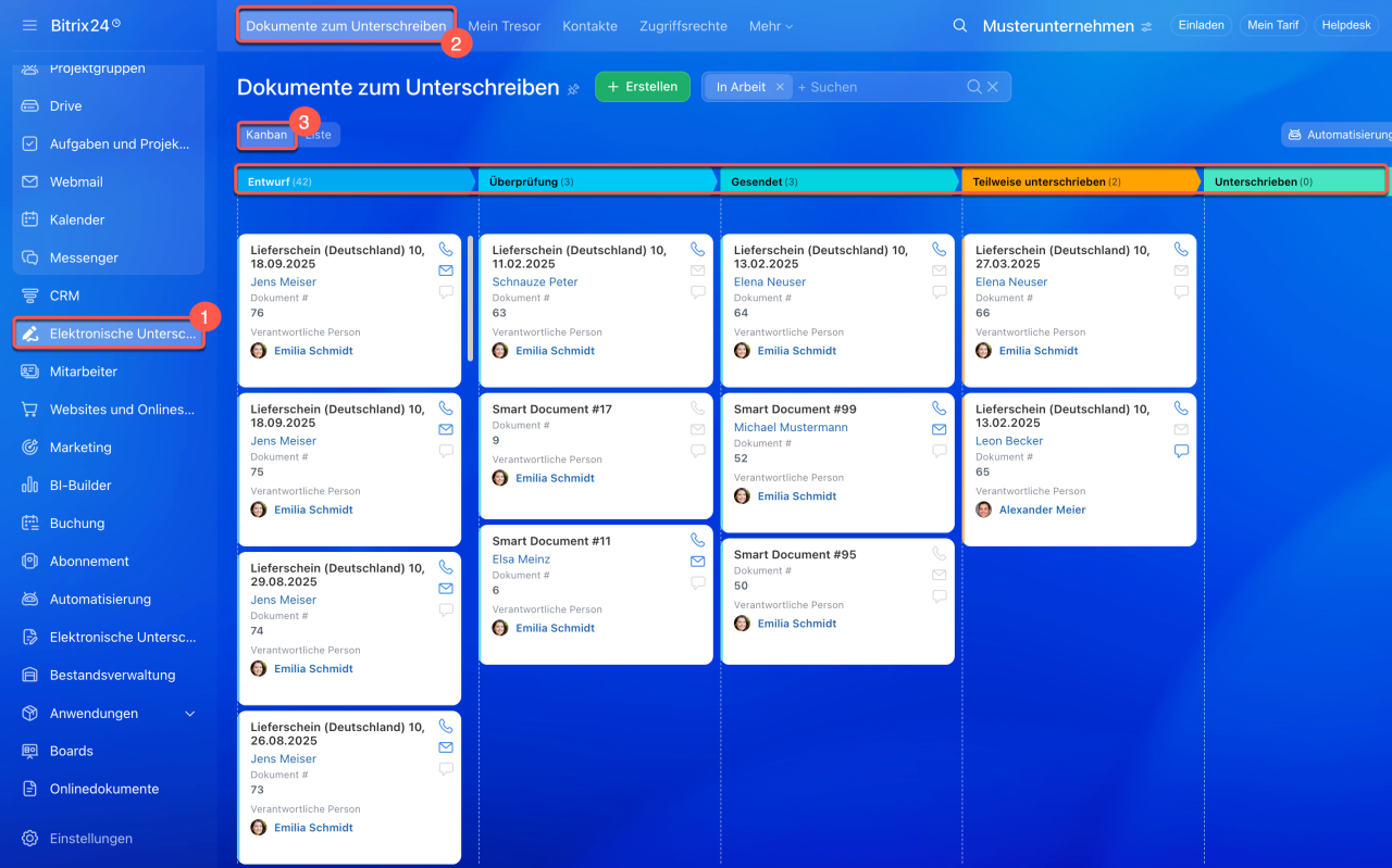 Öffnen Sie den Bereich Elektronische Unterschrift > Dokumente zum Unterschreiben > Kanban.
