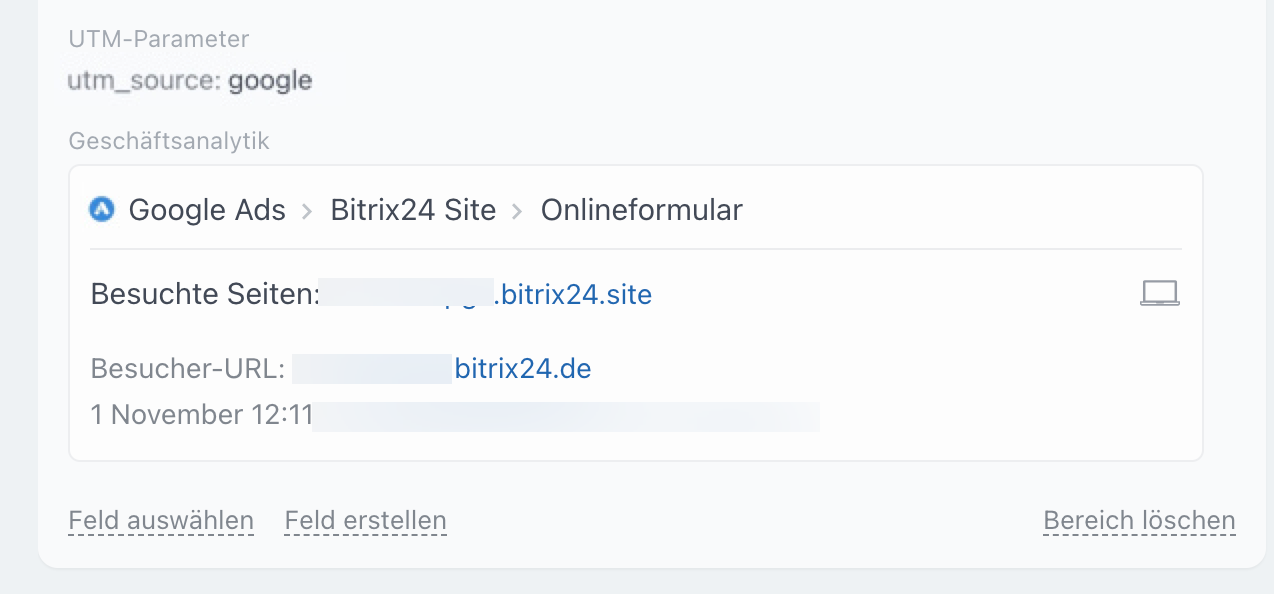 In der Geschäftsanalytik können Sie einen oder mehrere UTM-Parameter für jede Traffic-Quelle hinzufügen, zum Beispiel utm_source=google für Google Ads. Füllt ein Kunde ein Formular auf einer Seite aus, die über diesen Link aufgerufen wurde, wird automatisch ein Lead im CRM angelegt – mit der Angabe, dass die Quelle "Google Ads" ist.