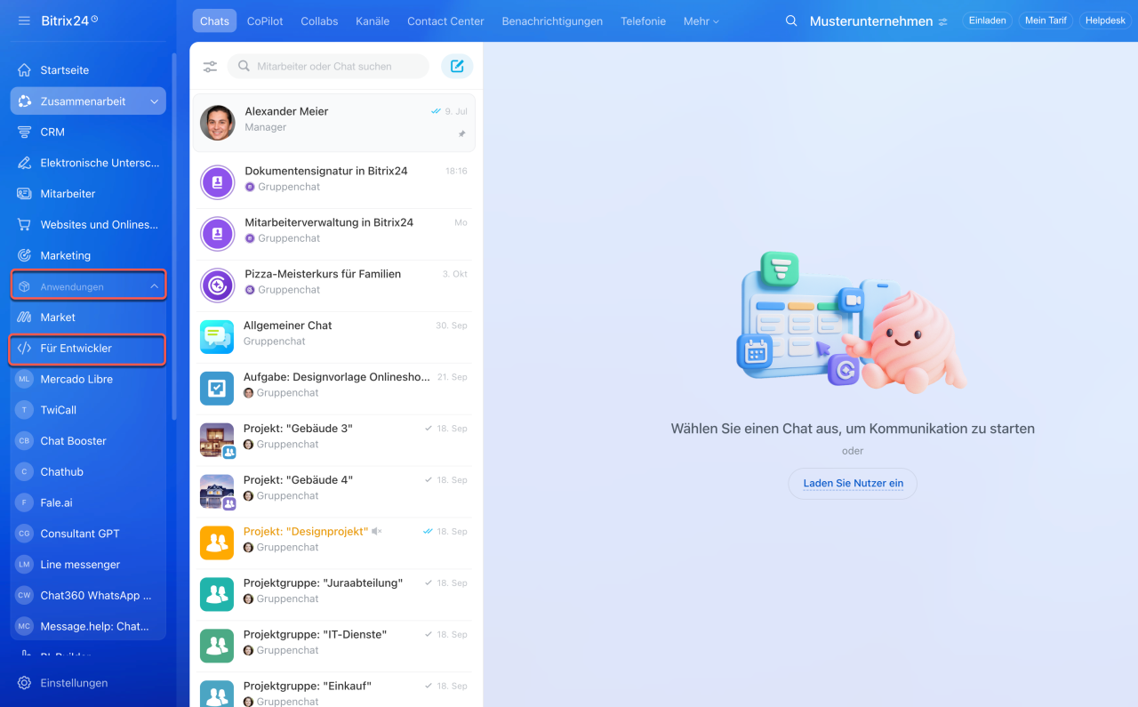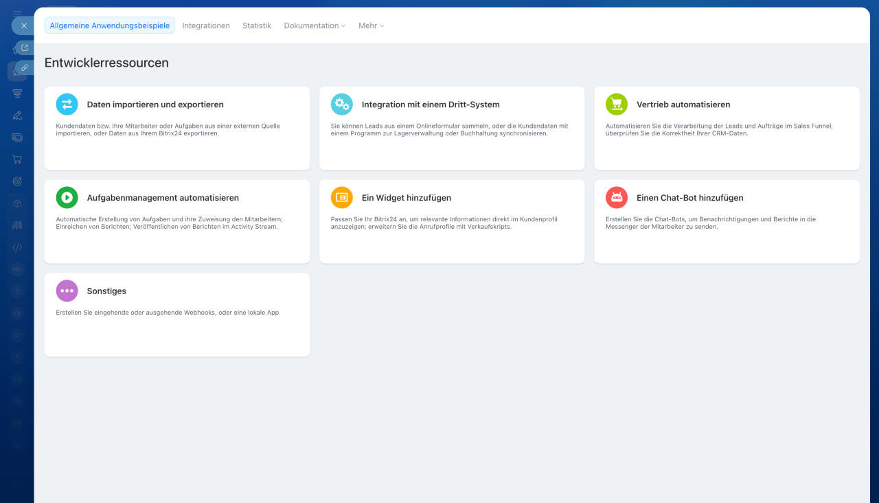 Der Bereich Für Entwickler richtet sich an Unternehmen, die eigene Anwendungen erstellen, Integrationen einrichten oder Bitrix24 Tools an ihre Bedürfnisse anpassen möchten. Hier haben Sie folgende Möglichkeiten: