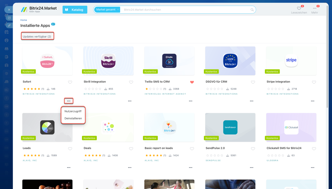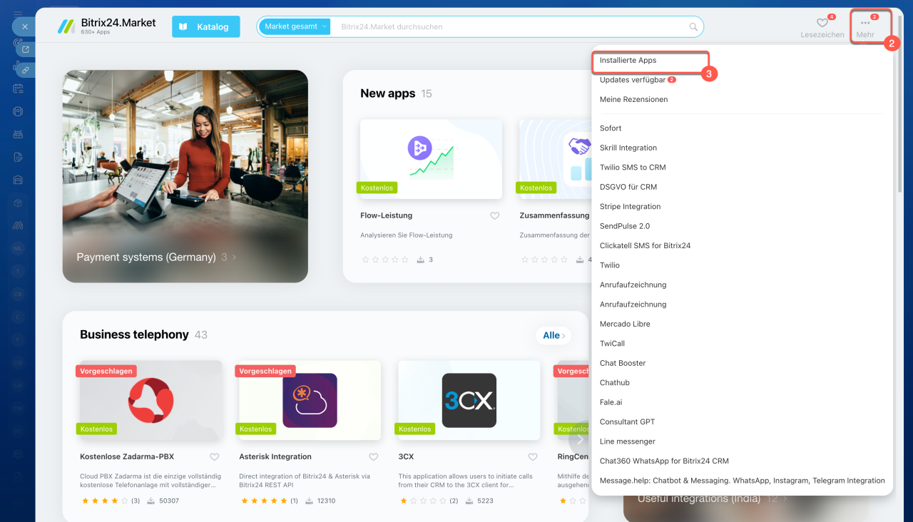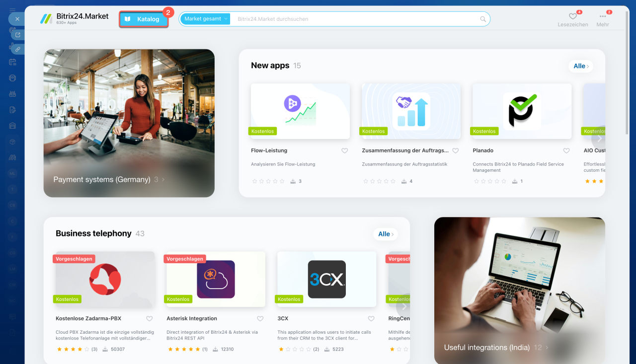 Bitrix24 Market ist ein App-Katalog, der die Funktionen von Bitrix24 deutlich erweitert. Hier können Sie beispielsweise neue Zahlungsmethoden hinzufügen oder HR-Analysen mit wenigen Klicks einrichten. Der Katalog bietet über 600 Lösungen für verschiedene Geschäftsanforderungen.