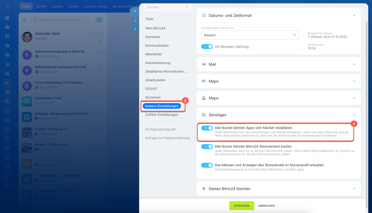 Standardmäßig können nur Administratoren Apps aus dem Bitrix24 Market installieren. Sie können diese Berechtigung jedoch auch für alle Mitarbeiter freigeben. Gehen Sie dazu wie folgt vor: