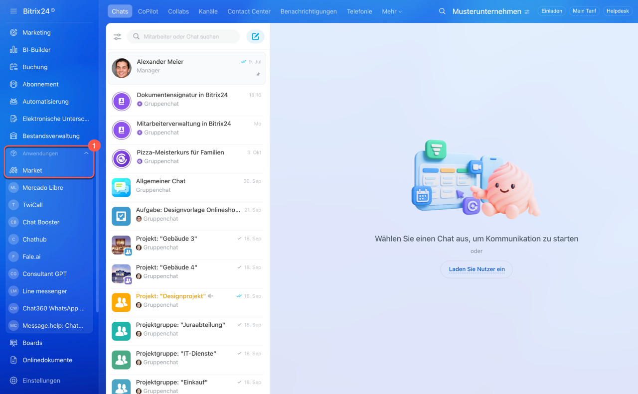 Mit Apps aus dem Bitrix24 Market können Sie die Funktionen von Bitrix24 erheblich erweitern. Beispiele: