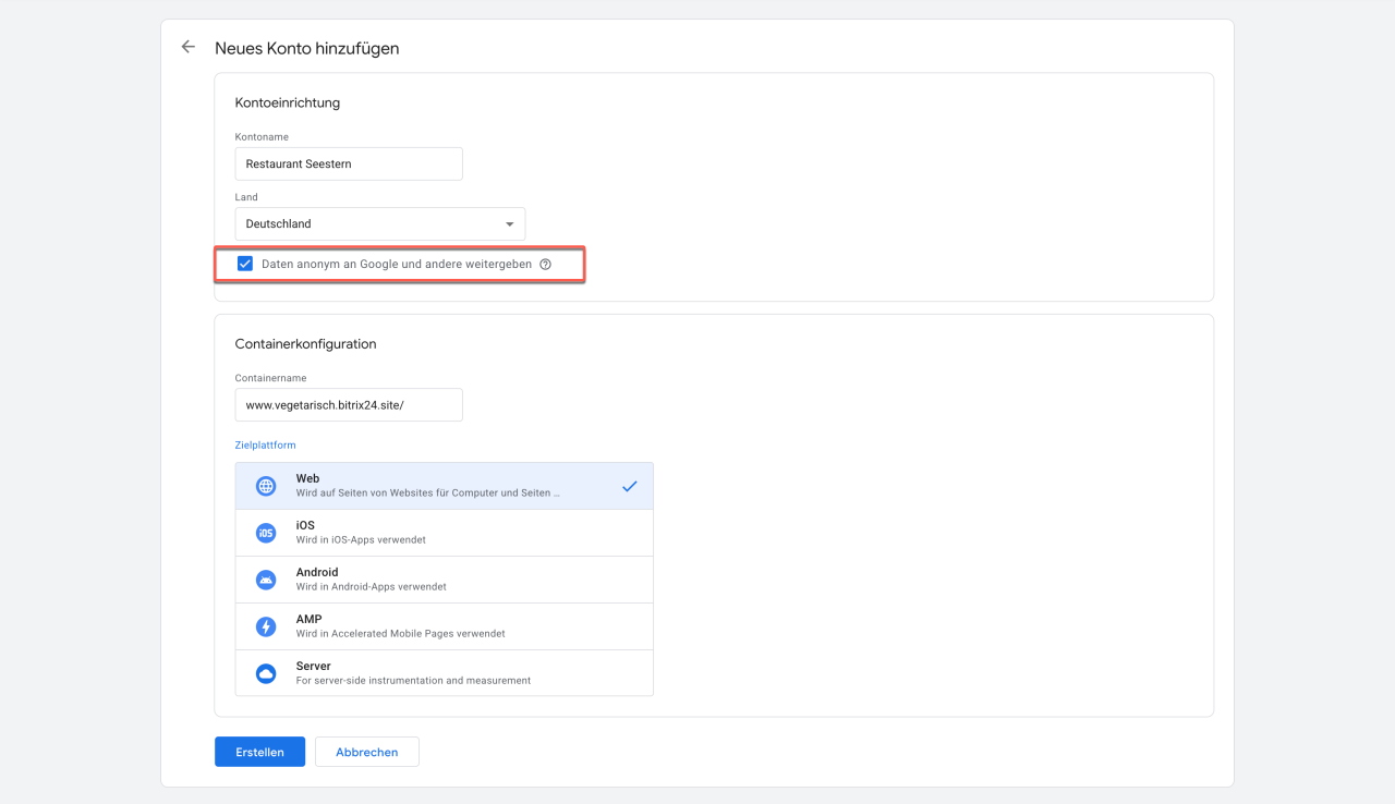 - Richten Sie ein Konto ein und geben Sie die Kontodaten ein: Ihre Website-Adresse und die Zielplattform (z. B. Web). Legen Sie fest, ob Ihre Daten anonym an Google oder andere Dienste weitergegeben werden dürfen.
