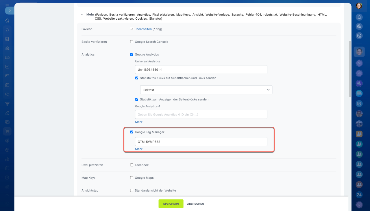 - Sie können den Google Tag Manager direkt in Ihre Bitrix24-Website integrieren, indem Sie einfach die Container-ID in den Einstellungen hinterlegen.