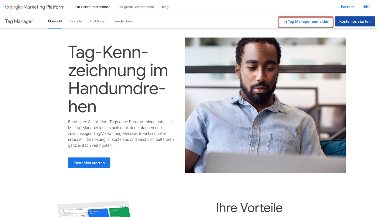- Rufen Sie die Startseite von Google Tag Manager auf und klicken Sie auf In Tag Manager anmelden.