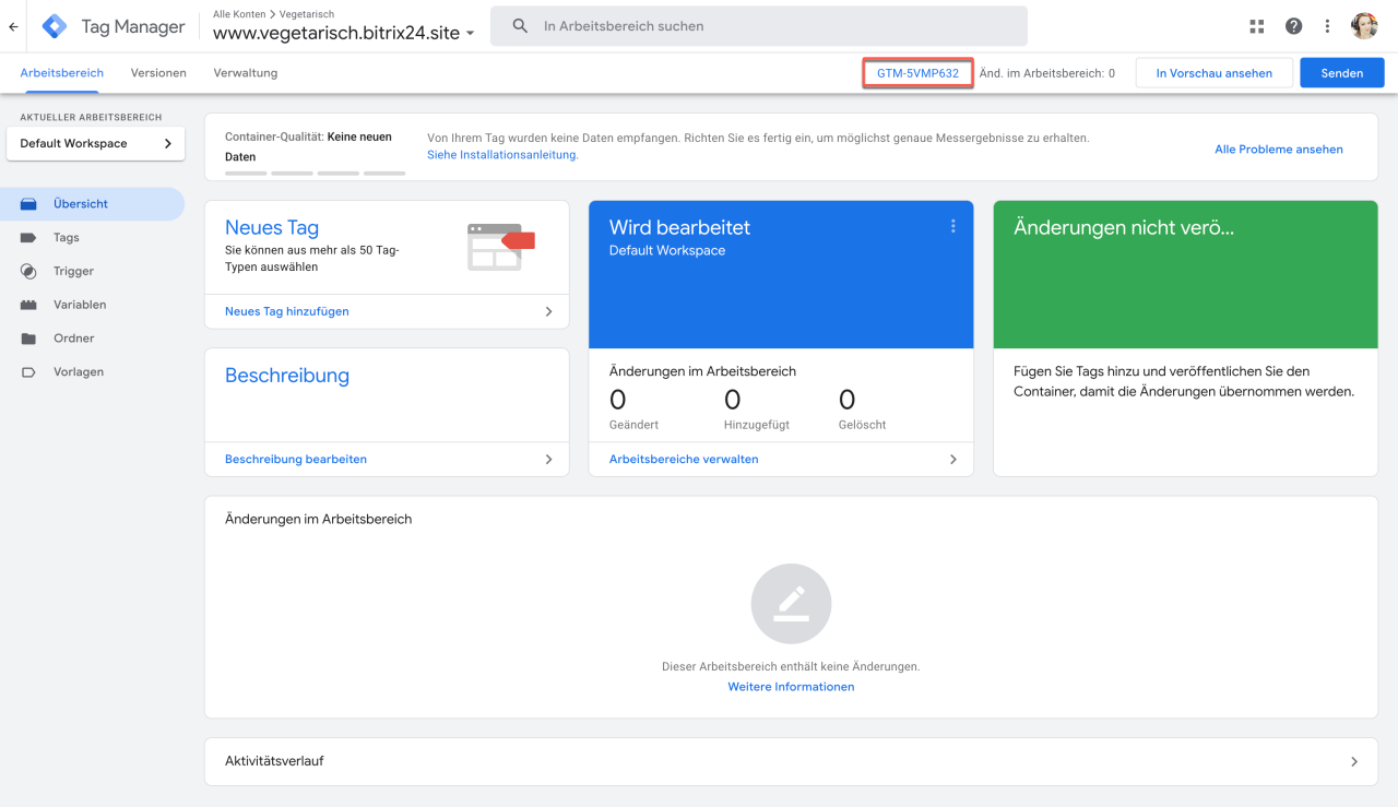 - Richten Sie das Google Tag Manager-Konto ein, erstellen Sie einen Container und fügen Sie die Container-ID in Bitrix24 ein.