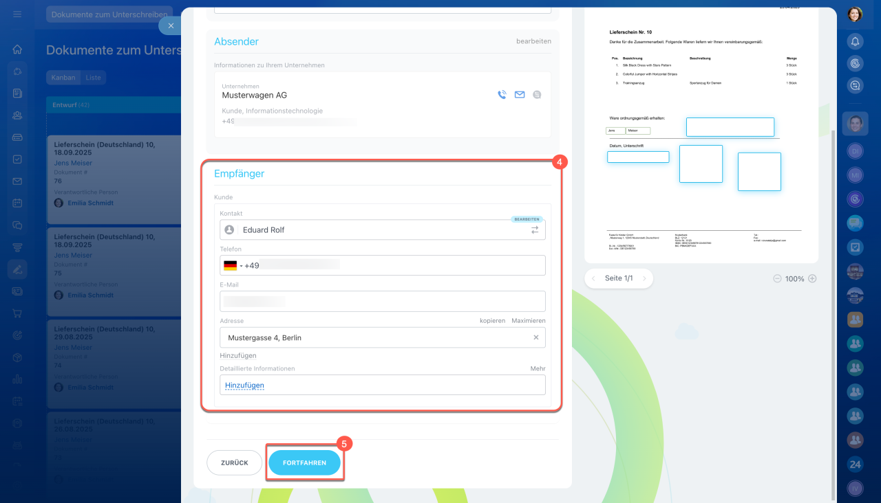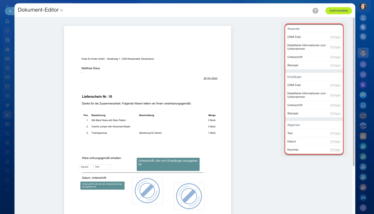 - Detaillierte Informationen, Unterschrift und Stempel werden vom Geschäftspartner beim Unterzeichnen des Dokuments abgefragt.
