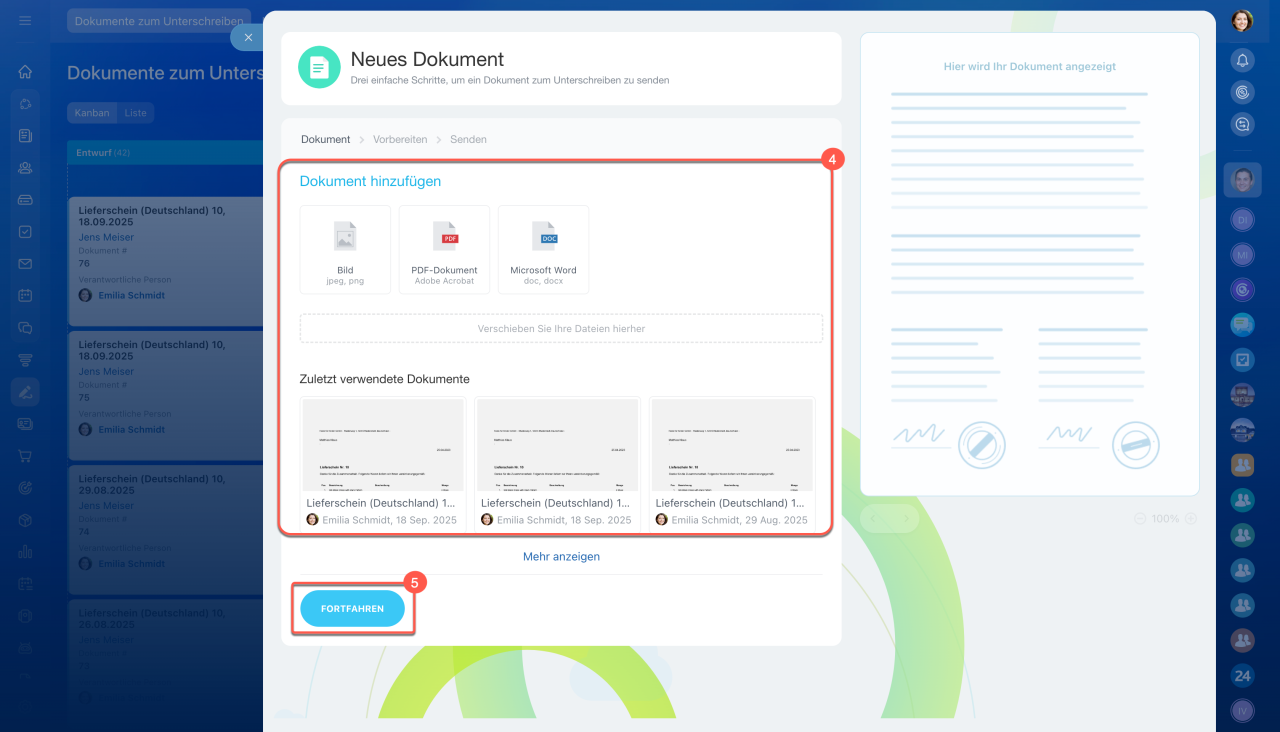 4–5. Laden Sie ein neues Dokument hoch oder wählen Sie eines aus den zuletzt erstellten aus. Klicken Sie auf Fortfahren.
