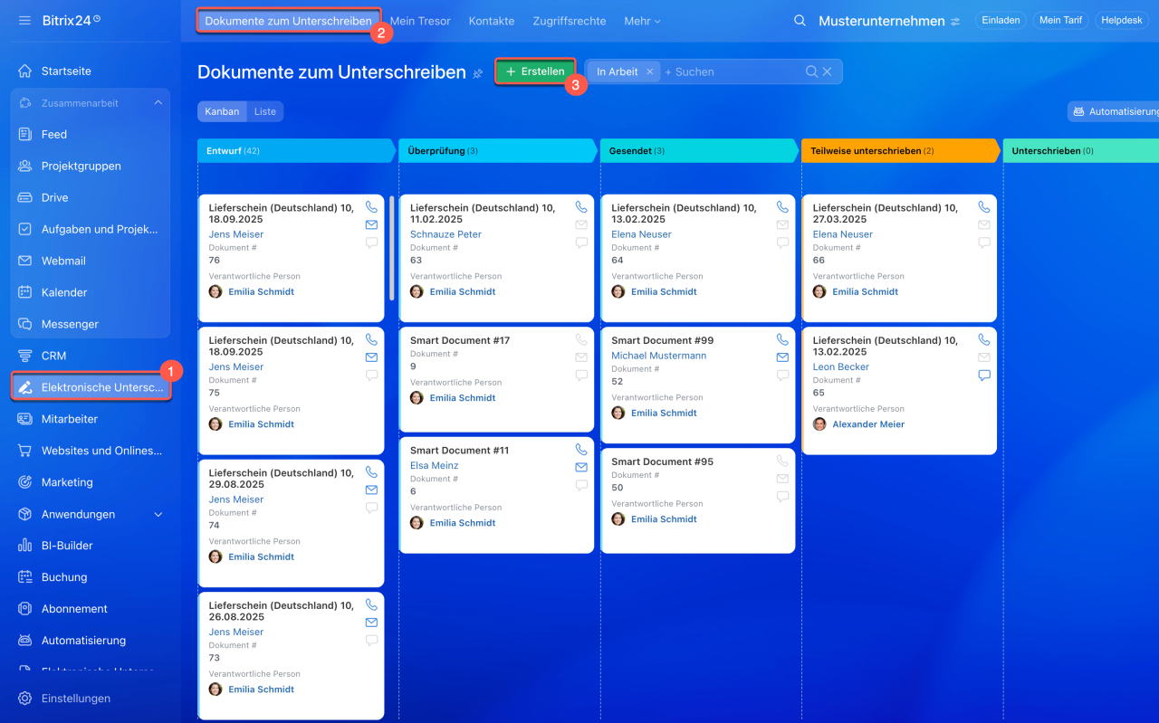 1–3. Öffnen Sie den Bereich Elektronische Unterschrift > Dokumente zum Unterschreiben > Erstellen.