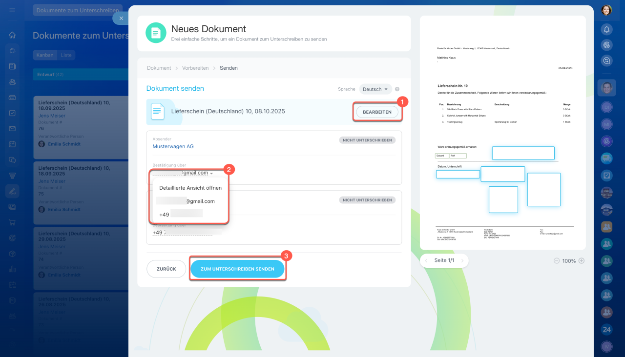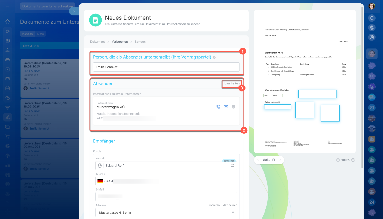 Zuerst erhält der Vertreter Ihres Unternehmens das Dokument. Nach seiner Unterschrift wird die Datei automatisch an den Geschäftspartner gesendet.