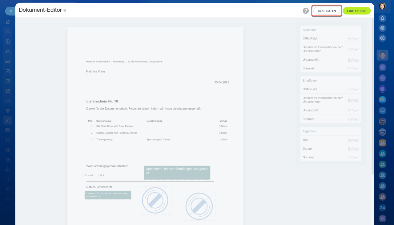 Bei Bedarf können Sie das Dokument bearbeiten, z. B. das Datum oder die Nummer ändern. Klicken Sie auf Bearbeiten.