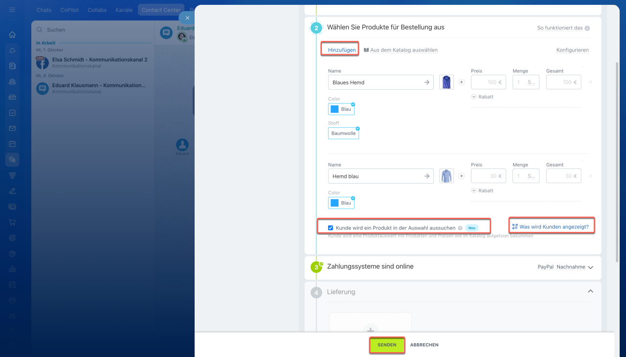 - Die Produktauswahl kann sowohl während der Bearbeitung eines Auftrags als auch direkt in einem Chat des Kommunikationskanals erstellt werden.