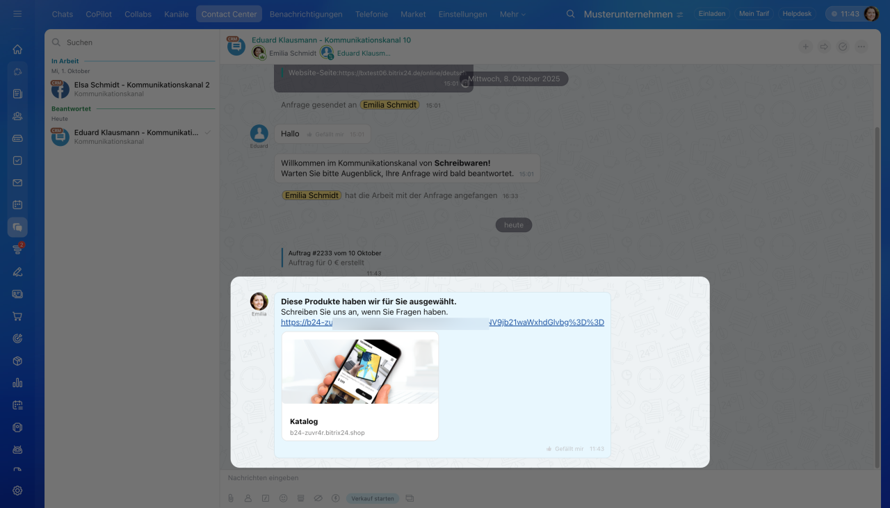 Nehmen wir an, ein Kunde nimmt über das Website-Widget oder WhatsApp Kontakt zu Ihnen auf. Seine Nachricht geht in Ihrem Bitrix24 ein, und Sie können ihm direkt eine Produktauswahl zusenden.