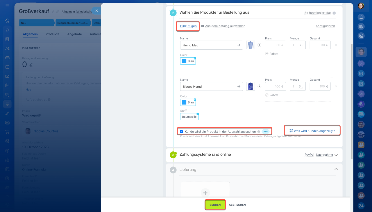 In Bitrix24 können Sie Ihren Kunden eine individuelle Produktauswahl zukommen lassen. So können diese direkt aus den vorgeschlagenen Artikeln auswählen und bequem online bezahlen.