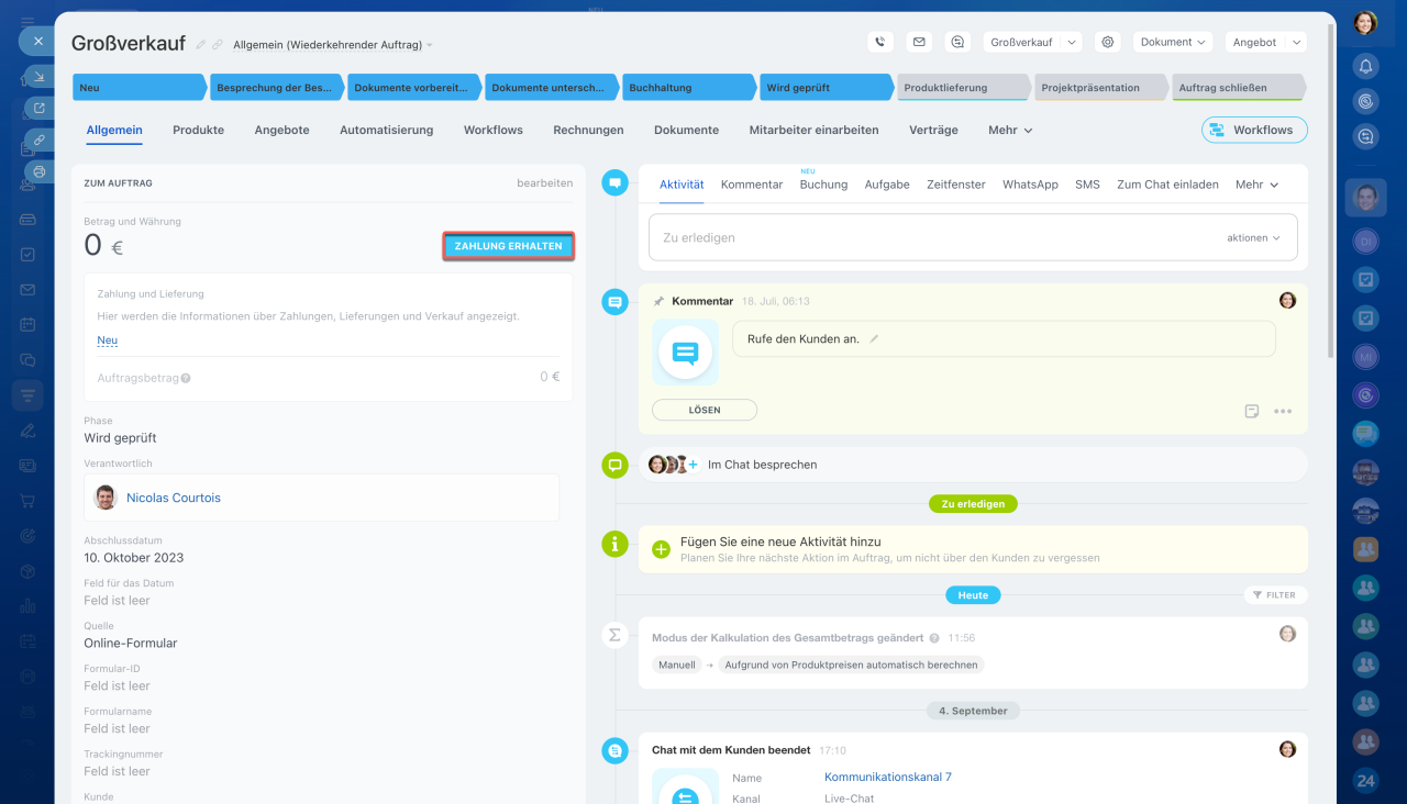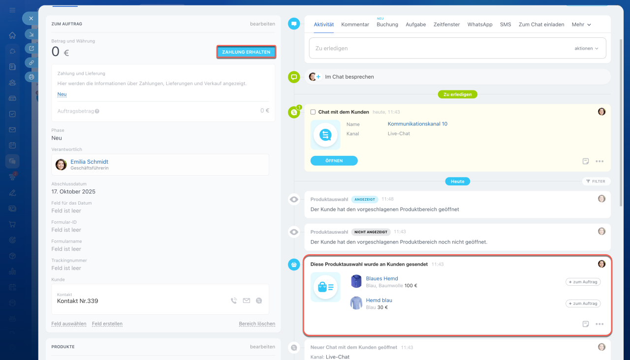 - Kunden erhalten einen Link im Chat oder per SMS, und die ausgewählten Produkte erscheinen in der Auftrags-Timeline.