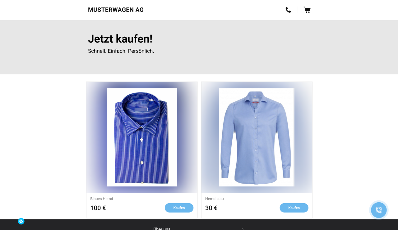 Beispiel: Ein Mitarbeiter sucht für einen Kunden, der nach einem blauen Hemd fragt, passende Optionen heraus, stellt diese zusammen und teilt einen Link mit dem Kunden. Sobald der Kunde seine Wahl trifft, wird das ausgewählte Produkt automatisch im Auftragsformular angezeigt.