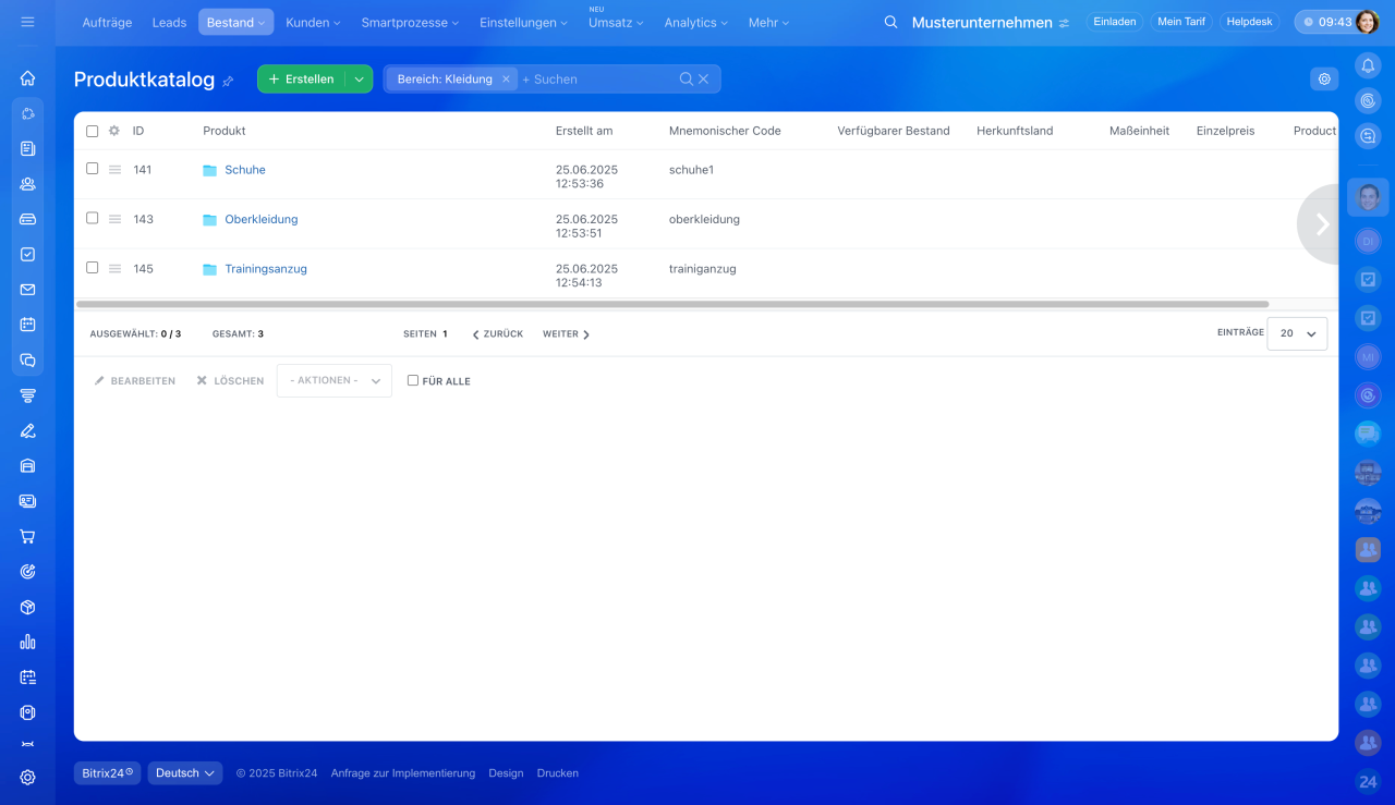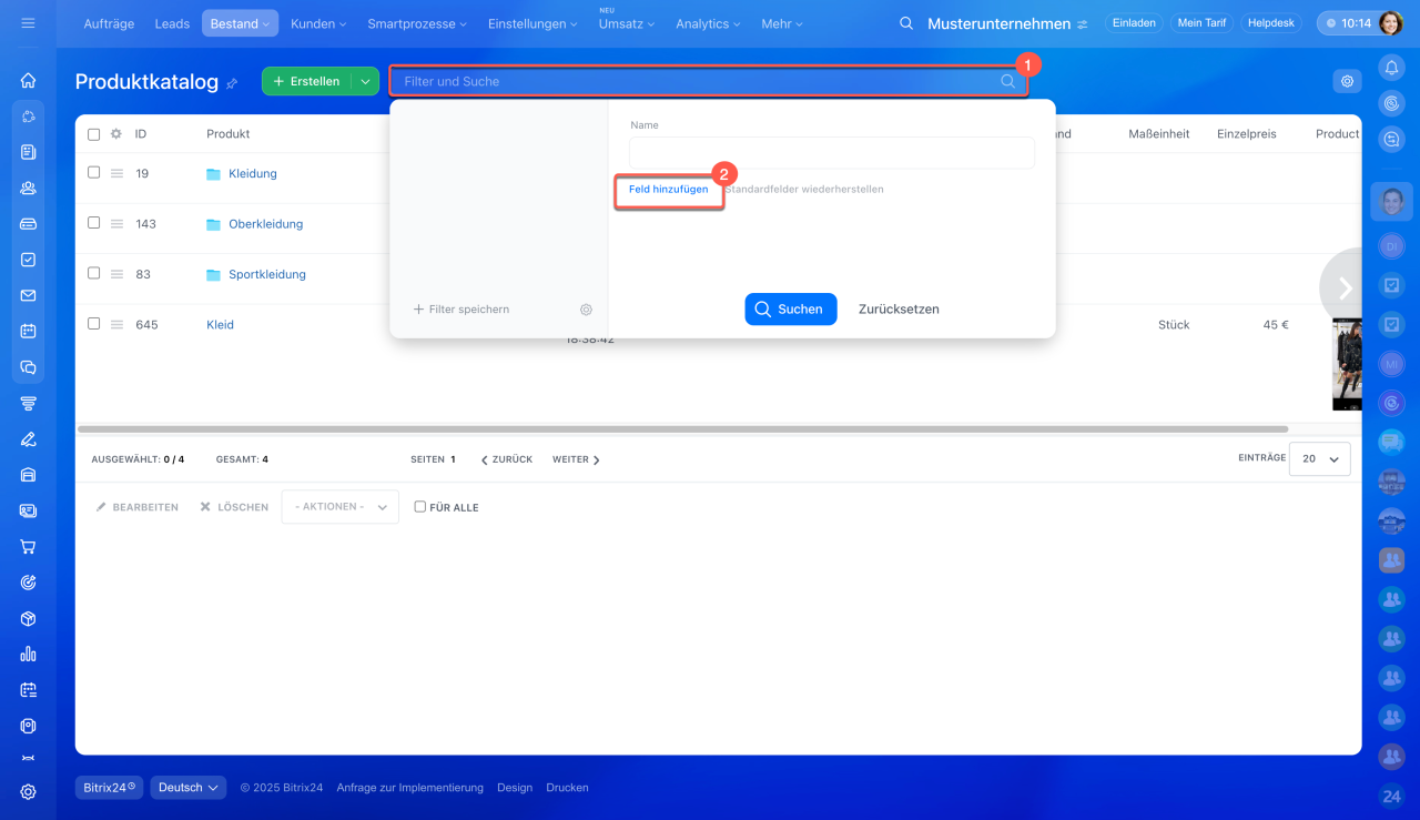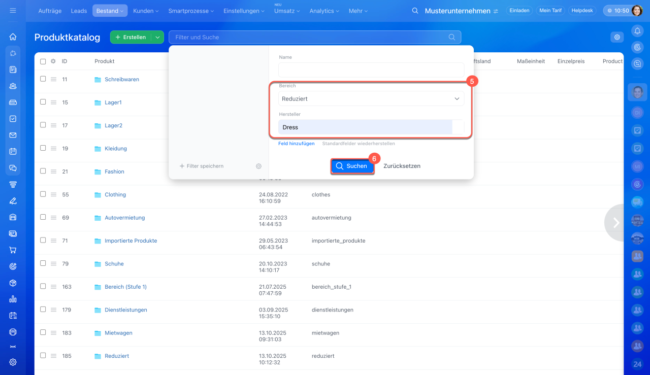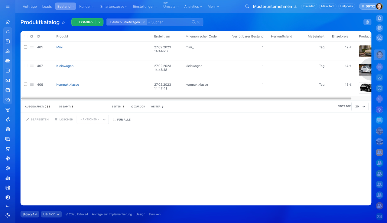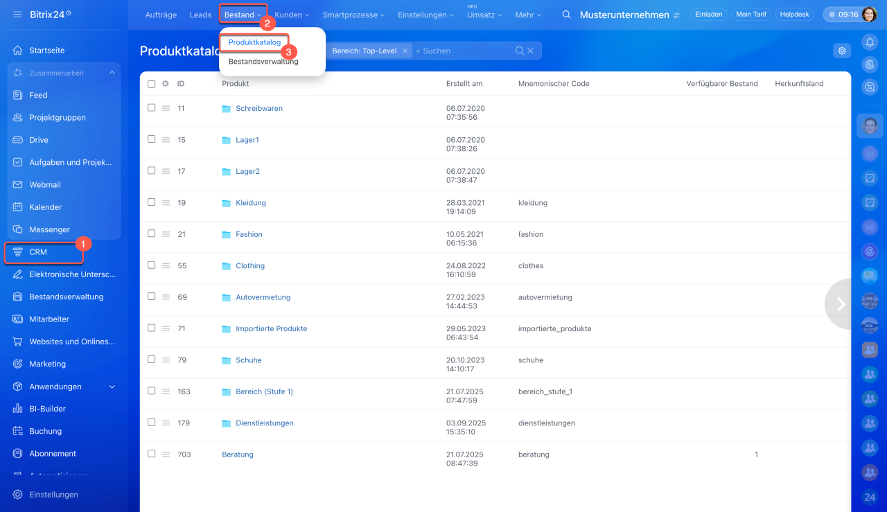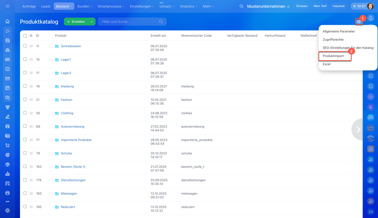 Öffnen Sie den Bereich CRM > Bestand > Produktkatalog.