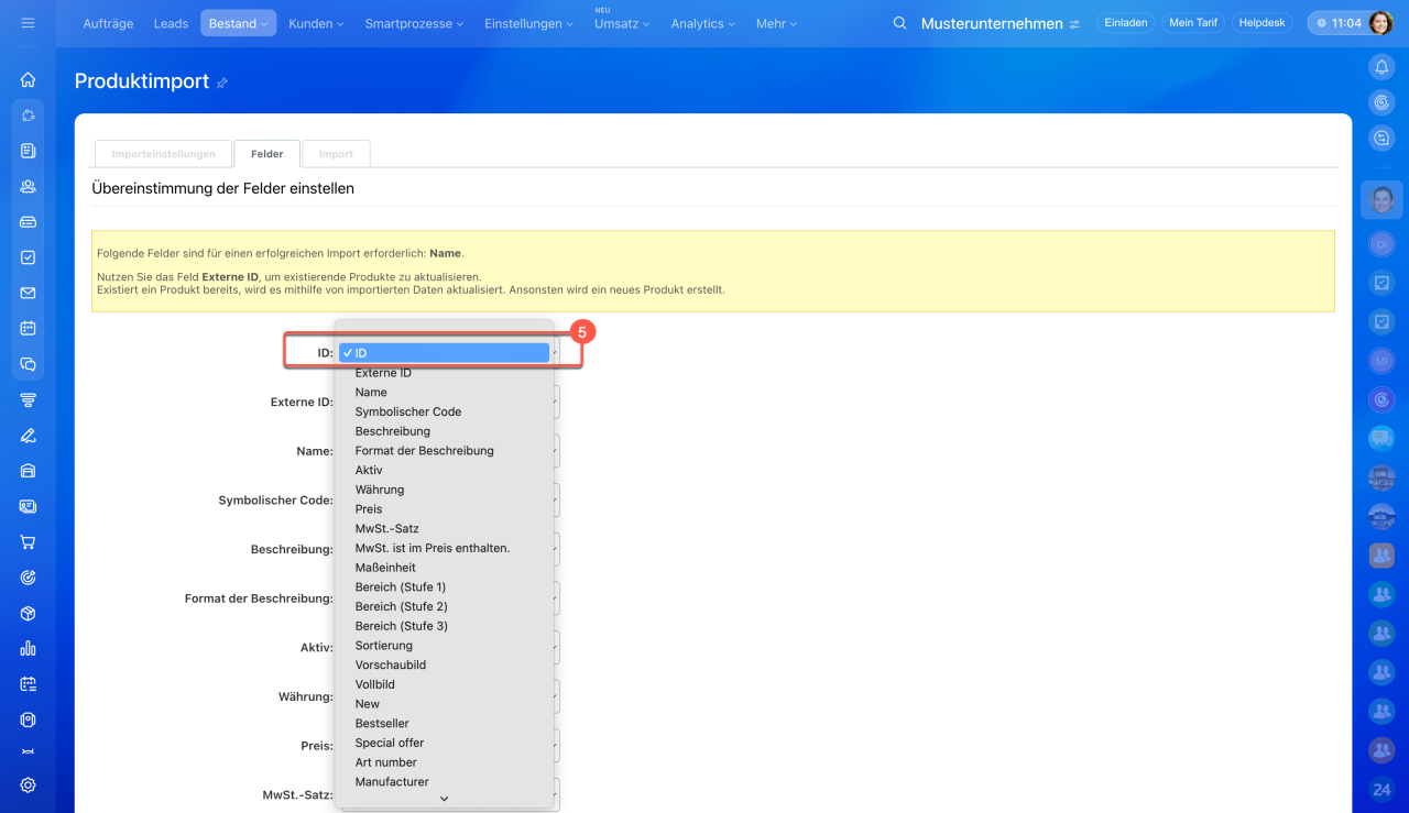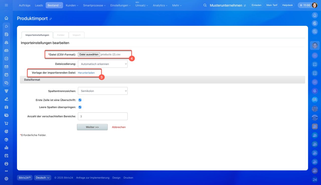 4–5. Laden Sie die Importdatei in Bitrix24 hoch und prüfen Sie die Feldzuordnung.
