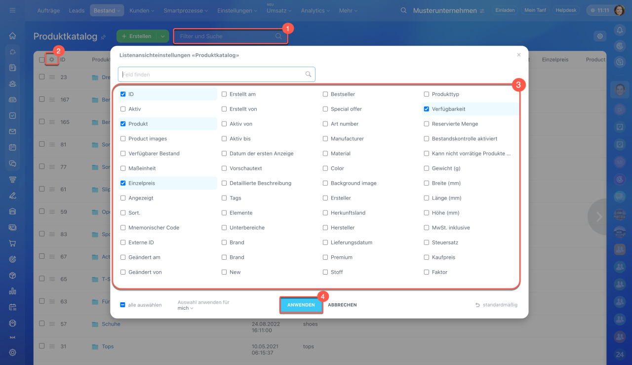 - Passen Sie die Liste der Produkte und Dienstleistungen individuell an Ihre Bedürfnisse an, um nur die relevanten Parameter anzuzeigen. Klicken Sie auf Einstellungen (⚙️), wählen Sie die gewünschten Spalten aus und bestätigen Sie mit Übernehmen.