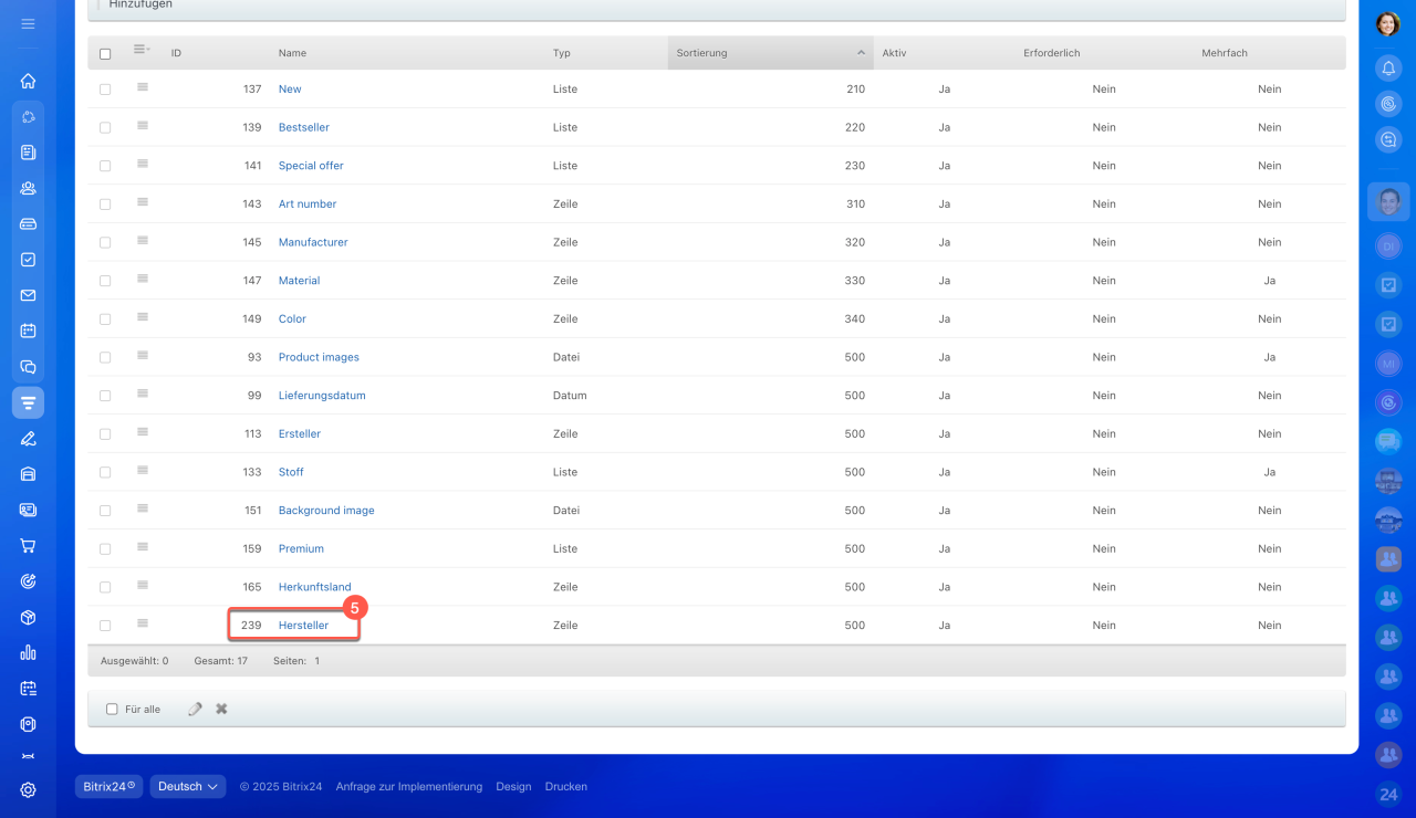 Wenn das gewünschte Feld nicht in der Liste enthalten ist, fügen Sie es in den Produkteigenschaften hinzu. Dies kann der Administrator von Bitrix24 oder CRM tun.