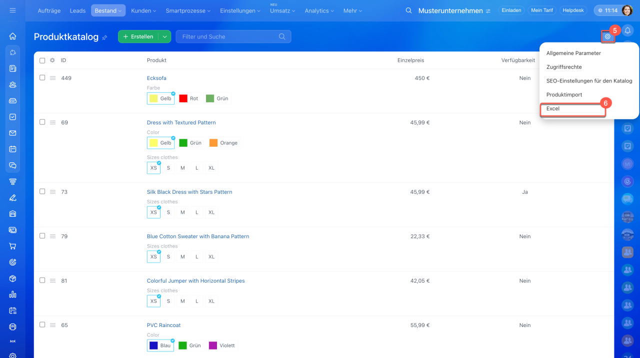 - Produkte und Dienstleistungen können importiert und exportiert werden. Sie können eine fertige Liste von Produkten und Dienstleistungen in Bitrix24 hochladen oder den Katalog in Excel exportieren, um Preise zu aktualisieren oder eine Preisliste zu erstellen.