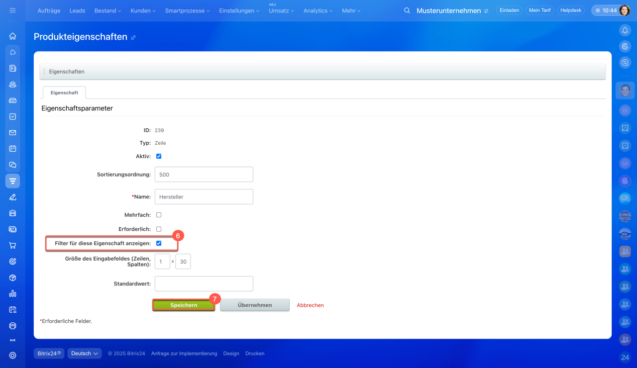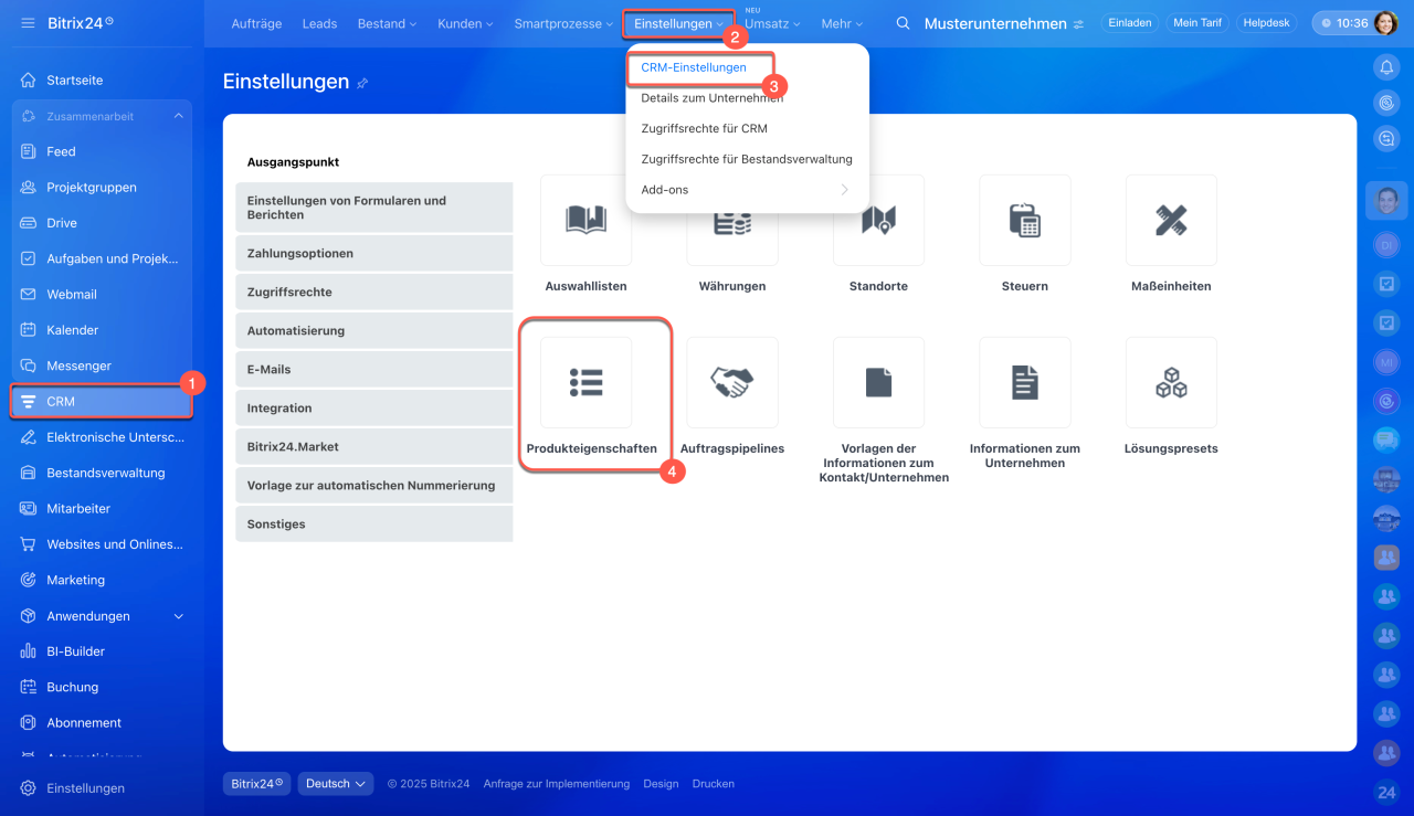 1–4. Öffnen Sie den Bereich CRM > Einstellungen > CRM-Einstellungen > Produkteigenschaften.