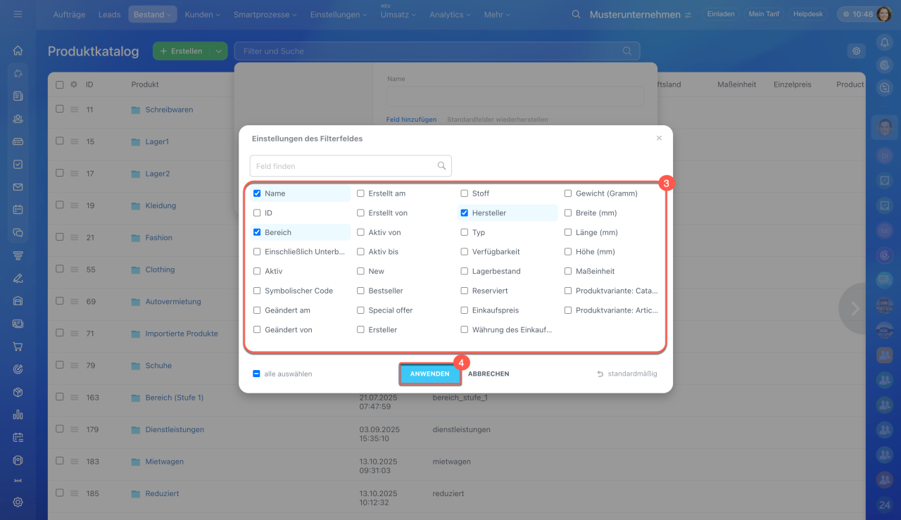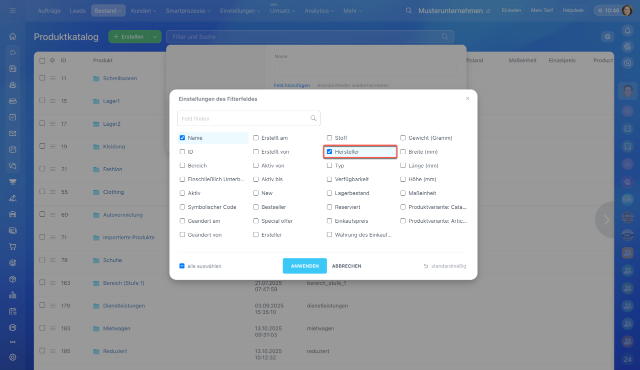 1–3. Klicken Sie auf Filter und Suche > Feld hinzufügen und wählen Sie die gewünschten Felder aus – in unserem Beispiel Bereich und Hersteller.