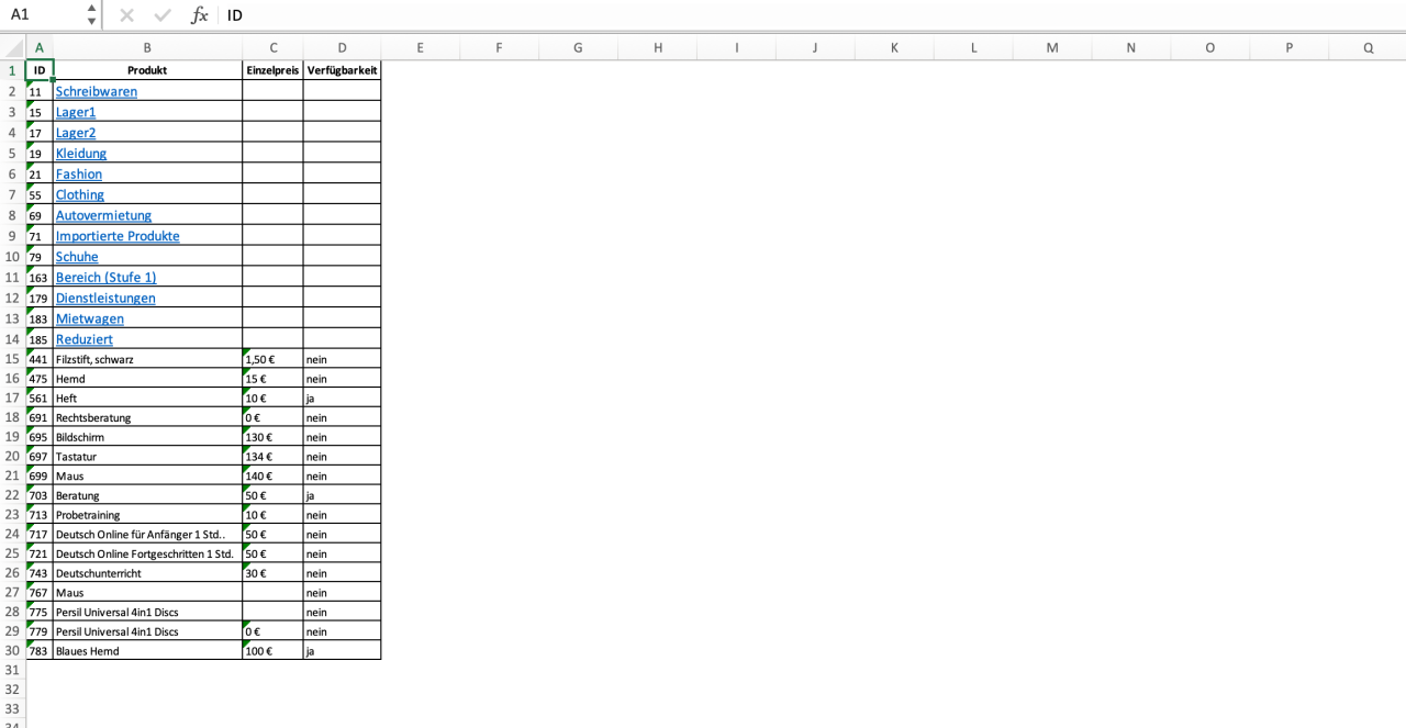 Falls Ihr Sortiment umfangreich ist, können Sie Produkte und Dienstleistungen in Bereiche unterteilen. So können Sie beispielsweise einen Bereich Bekleidung mit den Unterbereichen Herren und Damen sowie einen Bereich Dienstleistungen mit den Unterbereichen Anprobe und Chemische Reinigung erstellen. Dadurch wird die Suche nach den gewünschten Positionen deutlich vereinfacht.