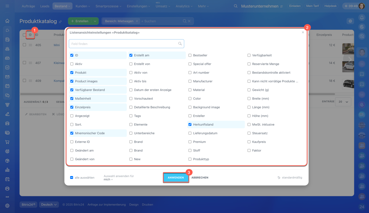 Passen Sie die Liste der Produkte und Dienstleistungen individuell an Ihre Bedürfnisse an, um nur die relevanten Parameter anzuzeigen. Klicken Sie auf Einstellungen (⚙️), wählen Sie die gewünschten Spalten aus und bestätigen Sie mit Übernehmen. So können Sie beispielsweise Artikelnummer, Lagerbestand oder Herkunftsland anzeigen lassen – ideal für einen schnellen Vergleich der wichtigsten Eigenschaften.