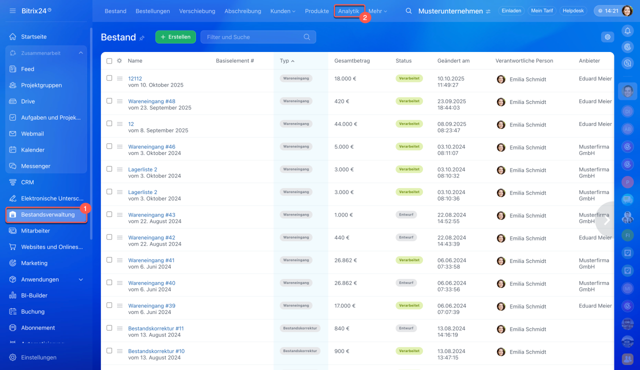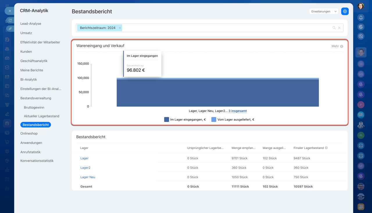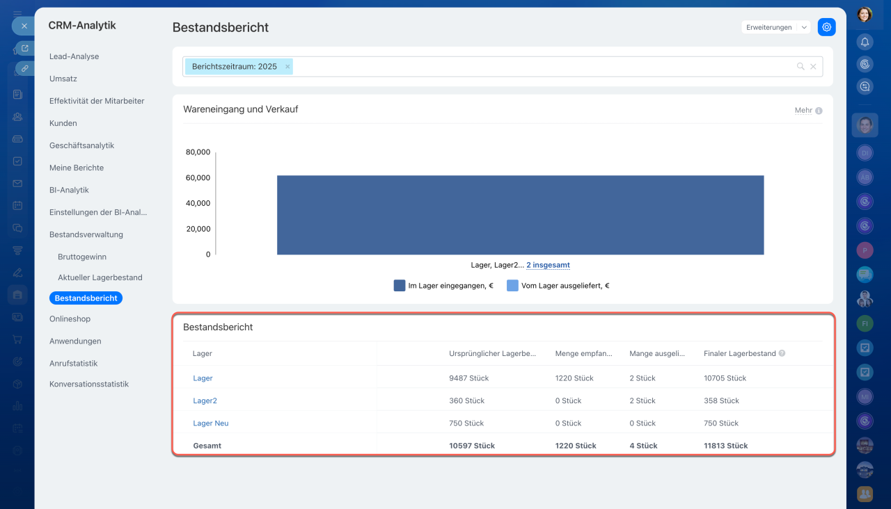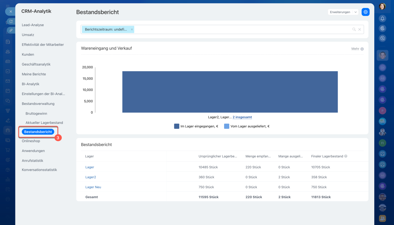 Um den Bericht anzuzeigen, öffnen Sie den Bereich Bestandsverwaltung > Analytics > Bestandsbericht.