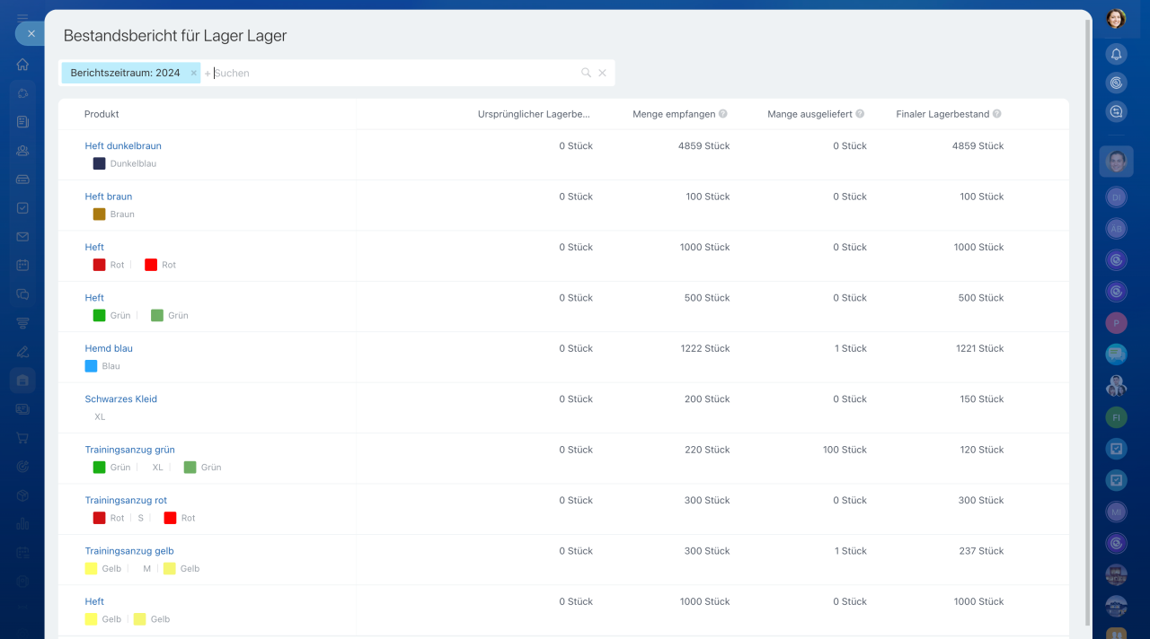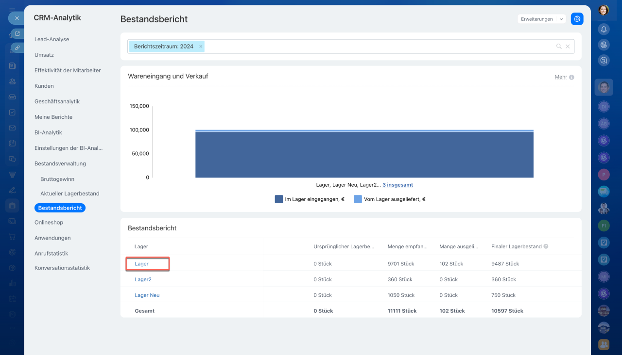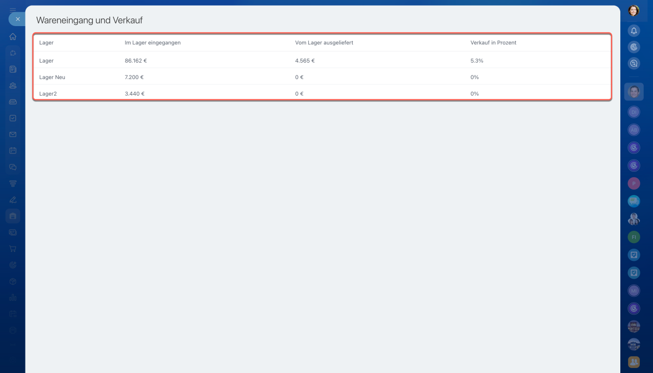 Für jedes Lager können Sie detaillierte Informationen mit einer Aufschlüsselung nach einzelnen Waren abrufen. Klicken Sie auf den Lagernamen, um eine Tabelle mit den Beständen, Eingängen und Verkäufen für den ausgewählten Zeitraum zu öffnen. Diese Daten helfen Ihnen zu erkennen, welche Waren sich schnell und welche langsam verkaufen. So können Sie fundierte Entscheidungen treffen – etwa Bestände aufzufüllen, Überschüsse in andere Lager zu verlagern oder einen Ausverkauf zu organisieren.