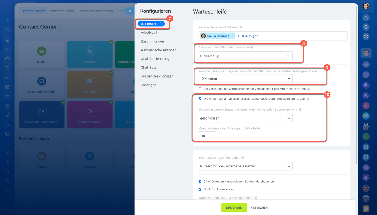 10. Die Option Die Anzahl der an Mitarbeiter gleichzeitig gesendeten Anfragen begrenzen aktivieren. Sie können ein Limit festlegen und bestimmen, welche Anfragen nicht berücksichtigt werden sollen. Wenn ein Mitarbeiter bereits die maximale Anzahl an Chats bearbeitet, werden neue Anfragen automatisch an andere Mitarbeiter verteilt.