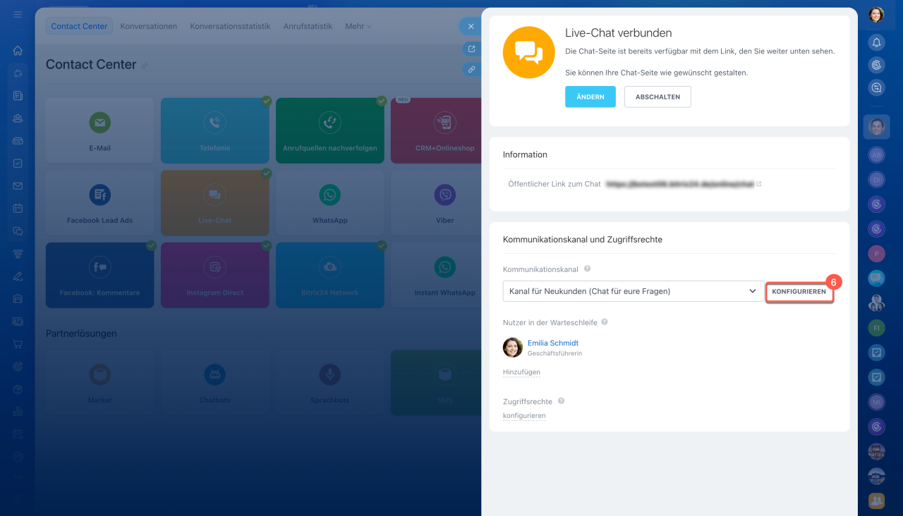- Klicken Sie in den Kanaleinstellungen auf Konfigurieren im Bereich Kommunikationskanal und Zugriffsrechte.