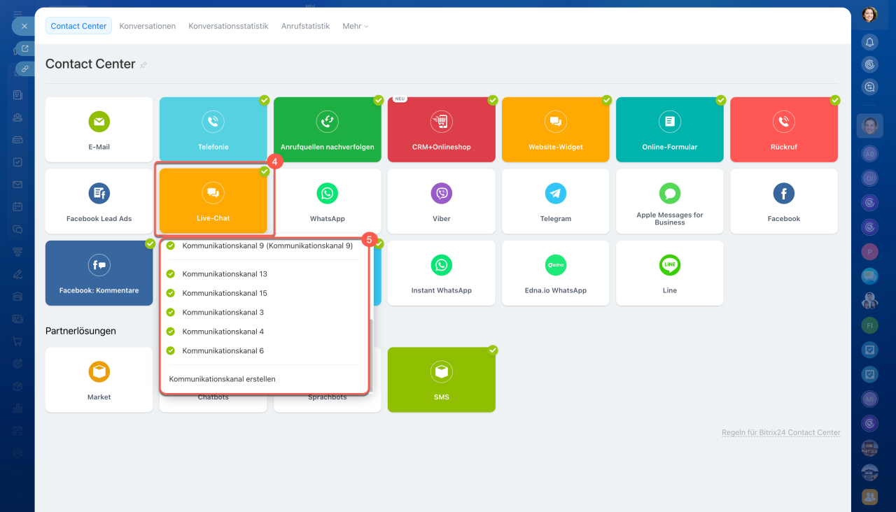 4–5. Wählen Sie den Service und den Kommunikationskanal aus.