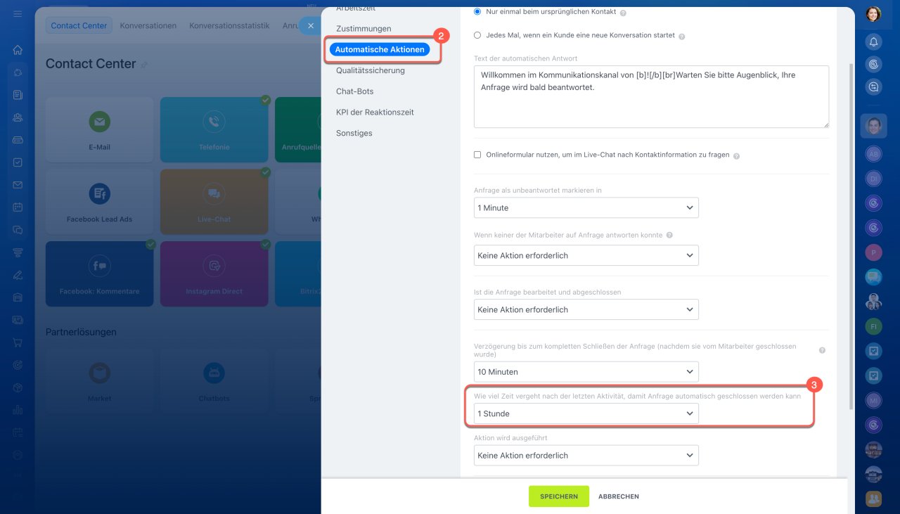 Automatisches Schließen von Chats einrichten. Diese Funktion ist standardmäßig aktiviert, kann aber von Administratoren oder Mitarbeitern mit den entsprechenden Berechtigungen angepasst werden. Sie hilft dabei, inaktive Dialoge schneller zu schließen und neue Anfragen ohne Verzögerung zu verteilen.